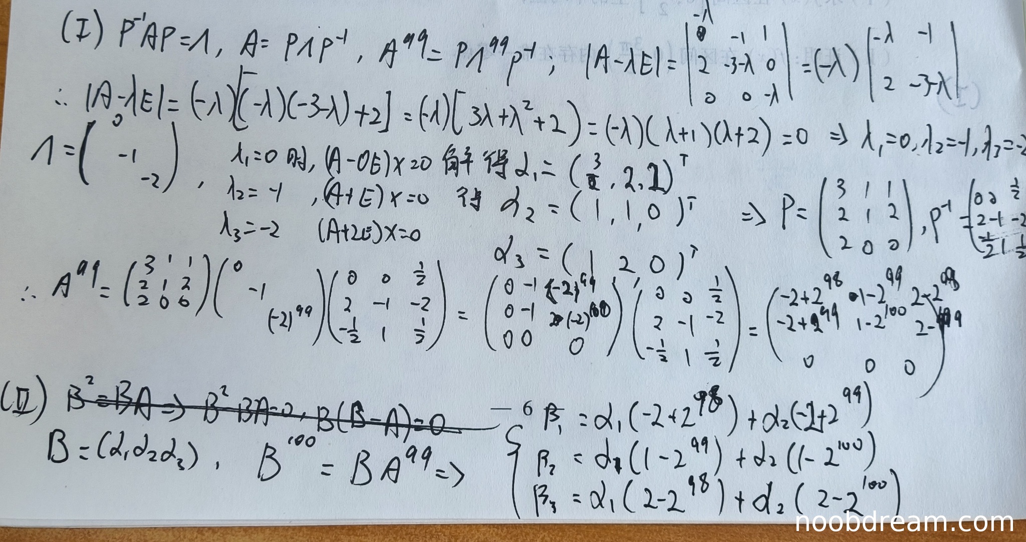 学生正确推导出B¹⁰⁰=BA⁹⁹(2分)。虽然思路正确,但由于第(1)问中A⁹⁹计算错误,导致最终β₁,β₂,β₃的线性组合表达式全部错误(扣3分)。得分为2分。