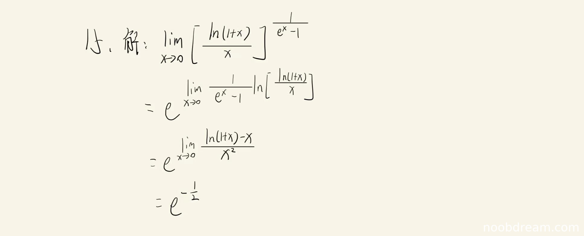 - 第二步:正确简化指数部分为 \( \lim_{x \to 0} \frac{\ln(1+x) - x}{x^2} \)(这里利用了 \( \ln \left( \frac{\ln(1+x)}{x} \right) = \ln(1 + \frac{\ln(1+x) - x}{x}) \sim \frac{\ln(1+x) - x}{x} \) 和 \( e^x - 1 \sim x \))
