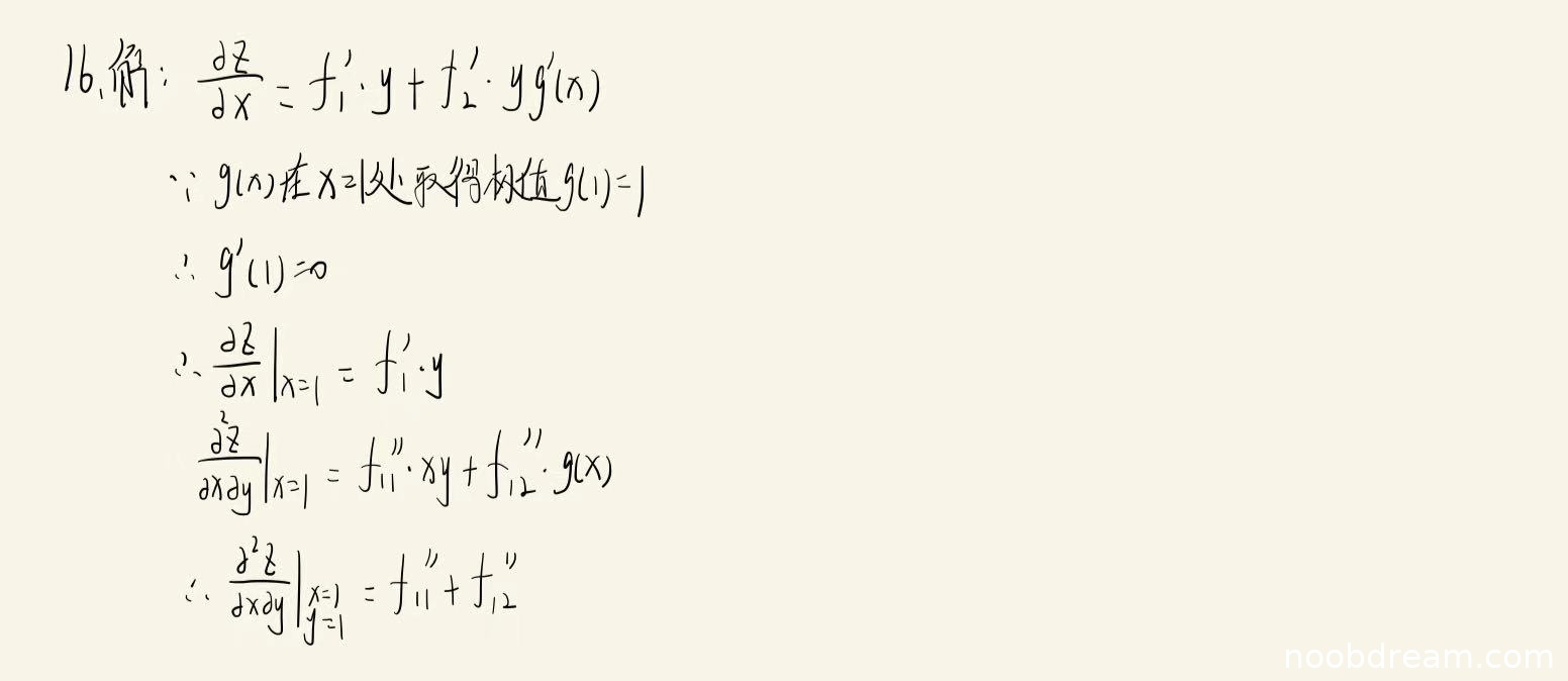 - 然而,学生最终代入 \(x=1, y=1, g(1)=1, g'(1)=0\) 后,得到的结果是 \(f_{11}'' + f_{12}''\),这与标准答案的最终结果一致。这是因为在 \(x=1\) 时,由于 \(g'(1)=0\),标准答案中多项式的后四项恰好为零,只剩下前两项。
