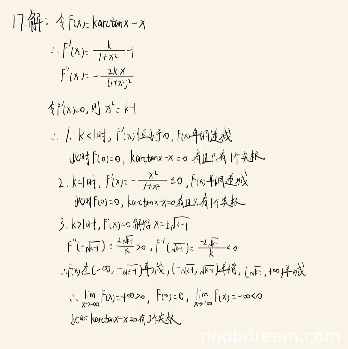 学生正确分析了k<1和k=1两种情况,指出F'(x)≤0且函数单调递减,结合F(0)=0得出只有1个实根。这部分分析完整正确,得4分。
