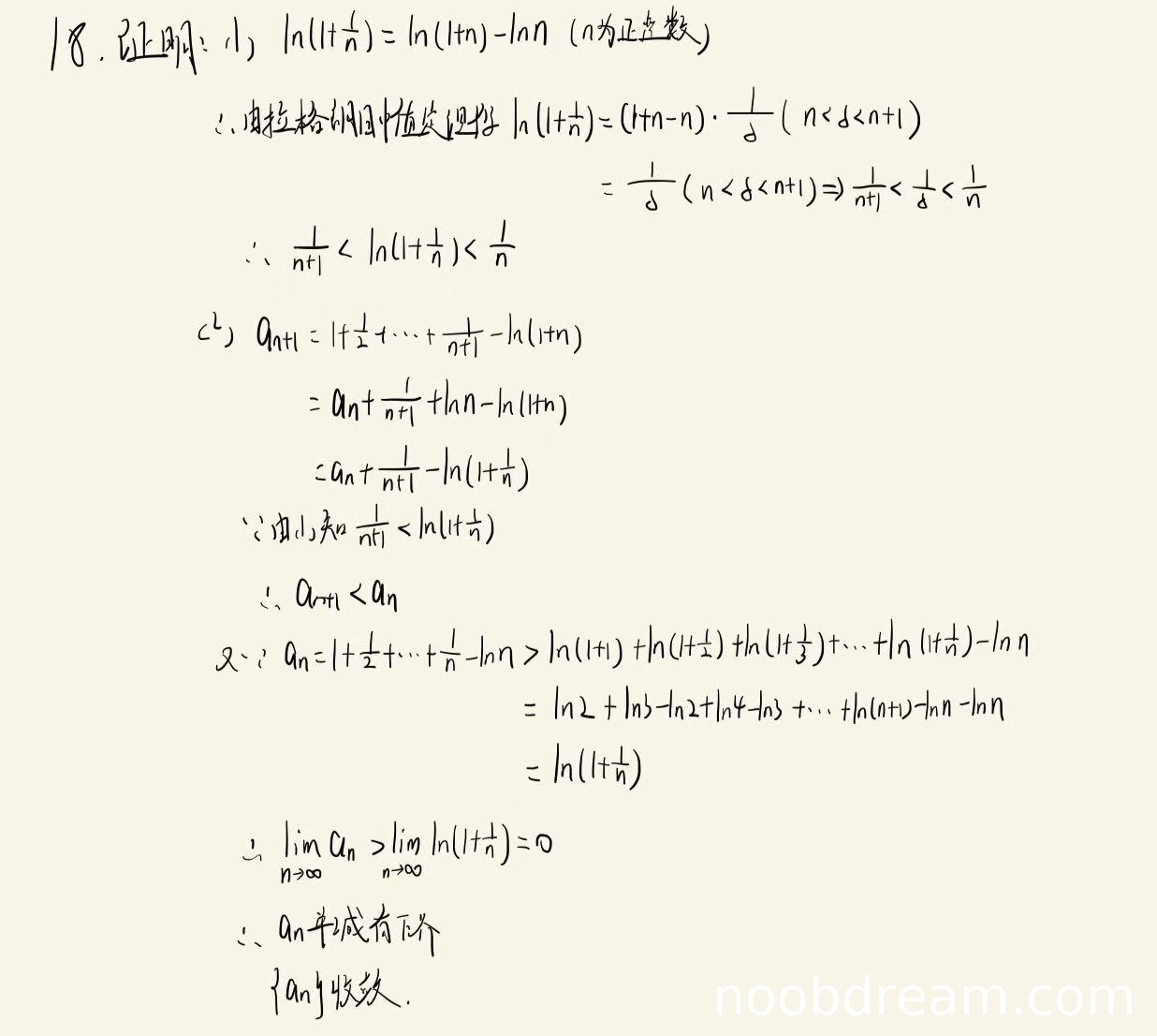 学生正确得出$a_{n+1}-a_n = \frac{1}{n+1}-\ln(1+\frac{1}{n}) < 0$,说明数列单调递减。在下界证明中,第一次识别有计算错误(最后得到$\ln(1+\frac{1}{n})$),但第二次识别正确得到$\ln(n+1)-\ln n$,根据禁止扣分原则,以正确识别为准。最终正确得出数列有下界且收敛的结论。得5分。