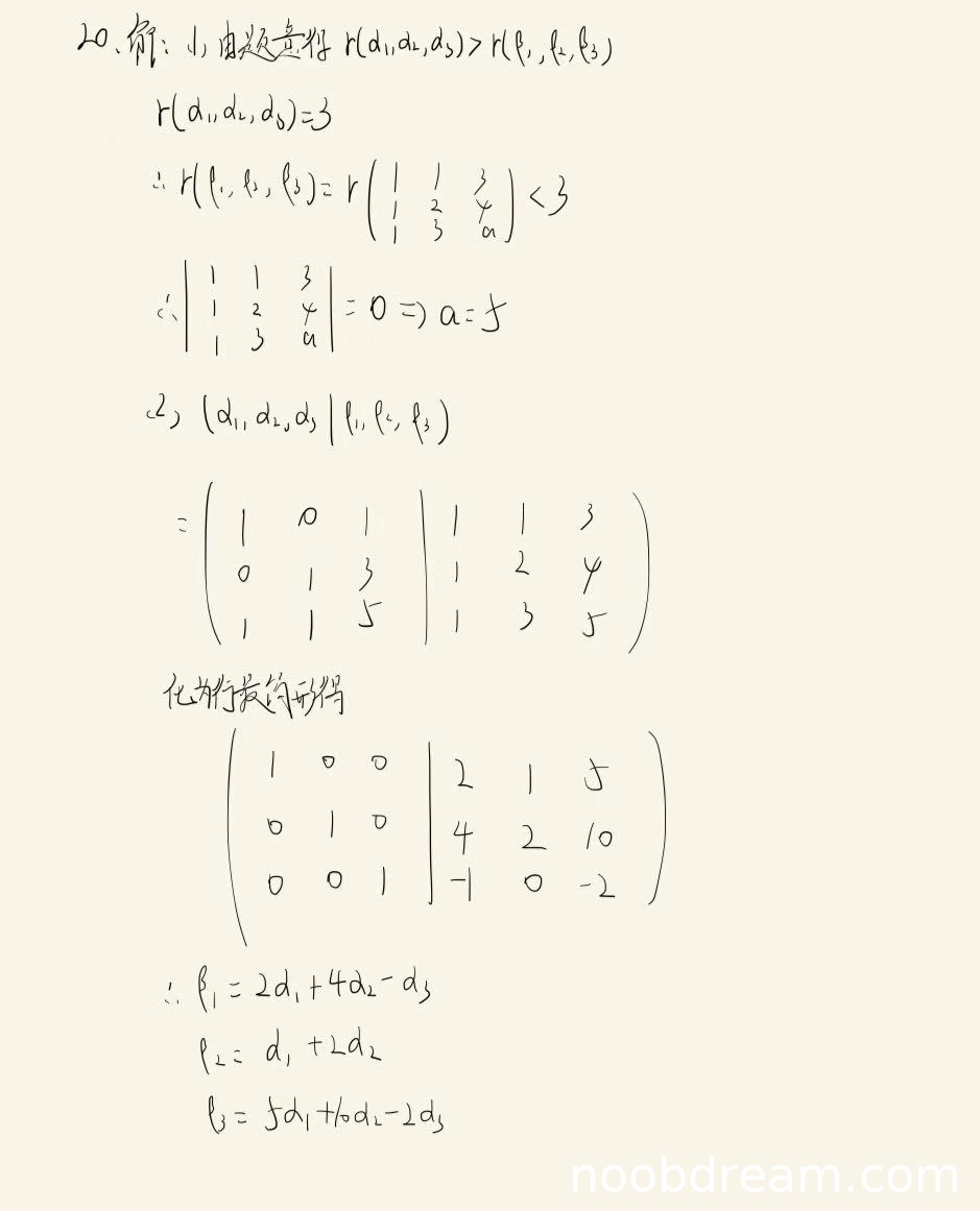 学生正确理解了题意,通过秩的关系得出矩阵(β₁,β₂,β₃)的秩小于3,从而行列式为0。虽然学生使用的矩阵与标准答案略有不同(β₃的坐标有差异),但计算过程正确,最终得到a=5。考虑到题目中α₃=(1,3,5)ᵀ,β₃=(1,3,5)ᵀ,学生可能将β₃误写为(1,3,a)ᵀ,但根据计算过程判断为识别错误或笔误。核心逻辑正确,给5分。