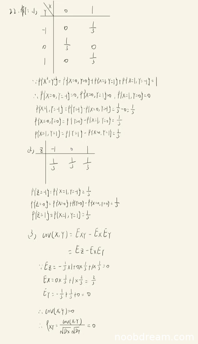 学生正确计算了协方差和相关系数,过程完整,结果正确。E(X)、E(Y)、E(Z)的计算都正确,最终得到相关系数为0,与标准答案一致,得3分。