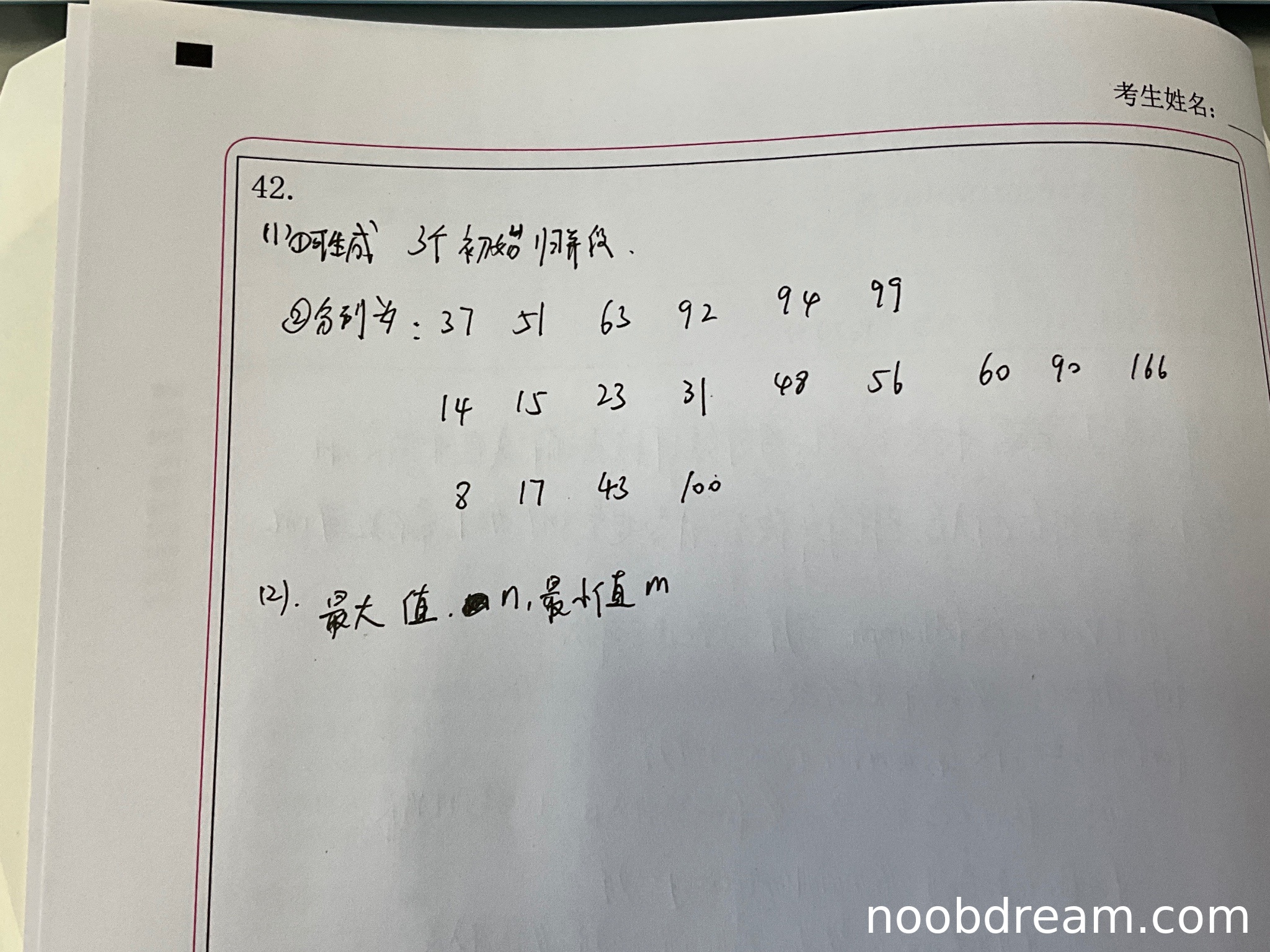 学生回答最大值n、最小值m,与标准答案完全一致,得2分。