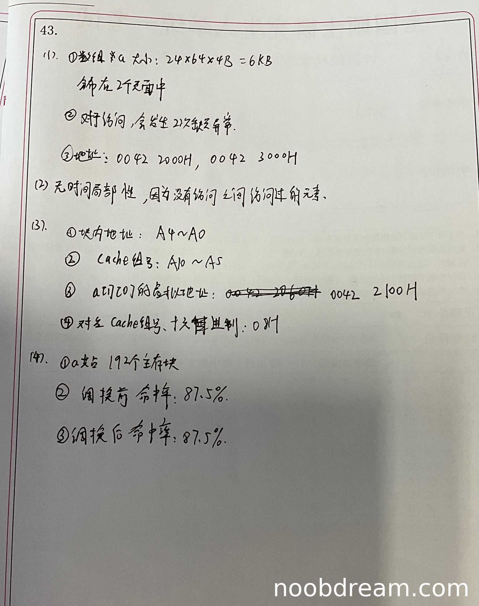 块内地址(A4~A0)和Cache组号(A10~A5)正确。a[1][0]的虚拟地址在第一次识别中正确(0042 2100H),第二次识别中错误(a[1][20]地址错误),但根据识别规则以正确的一次为准。Cache组号计算在第一次识别中错误(087应为8),第二次识别正确(08H),以正确为准。但组号计算过程未体现,扣1分。得3分。