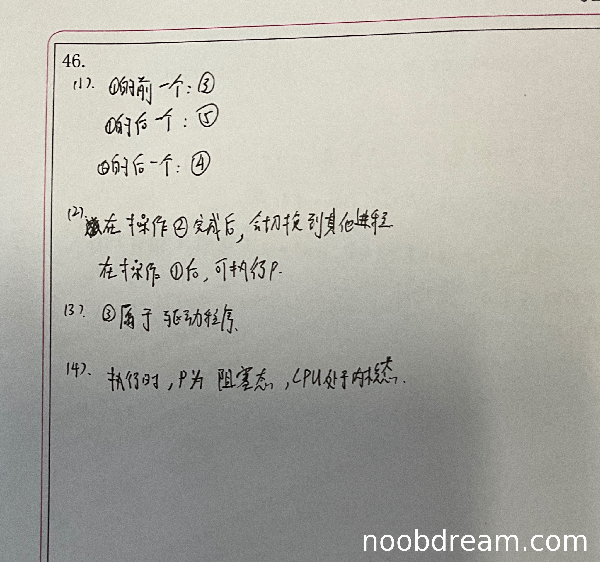 学生答案:在操作②完成后会切换到其他进程;在操作①后可执行P。