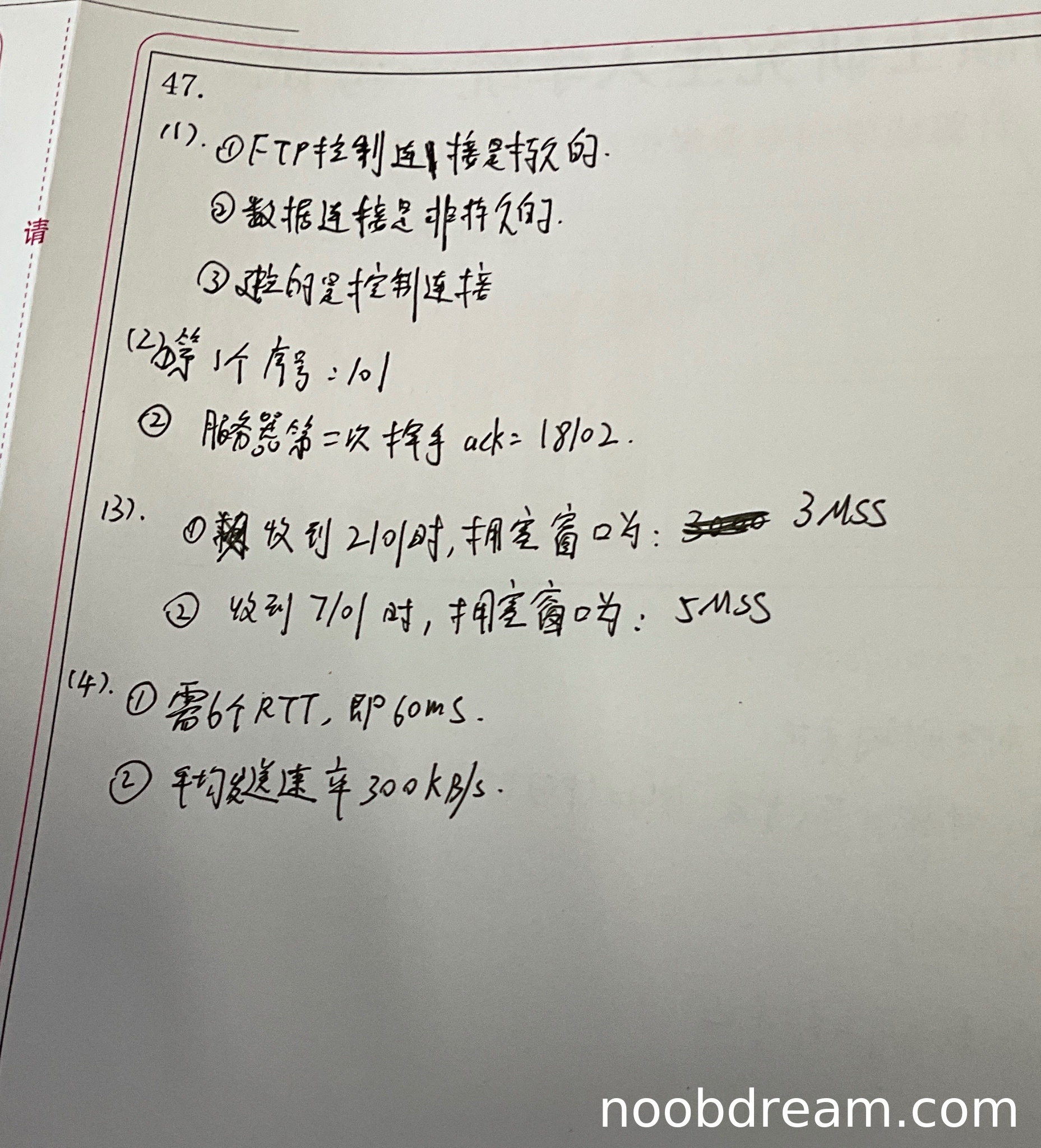 两次识别中"需6个RTT,即60ms"都正确;但"平均发送速率300KB/s"或"300kB/s"与标准答案"2.4Mbps"不一致。计算过程:文件大小18000B=144000bit,时间60ms=0.06s,速率=144000/0.06=2.4Mbps。学生答案300KB/s=2.4Mbps,虽然单位表述不同但数值等价,应视为正确,得2分。