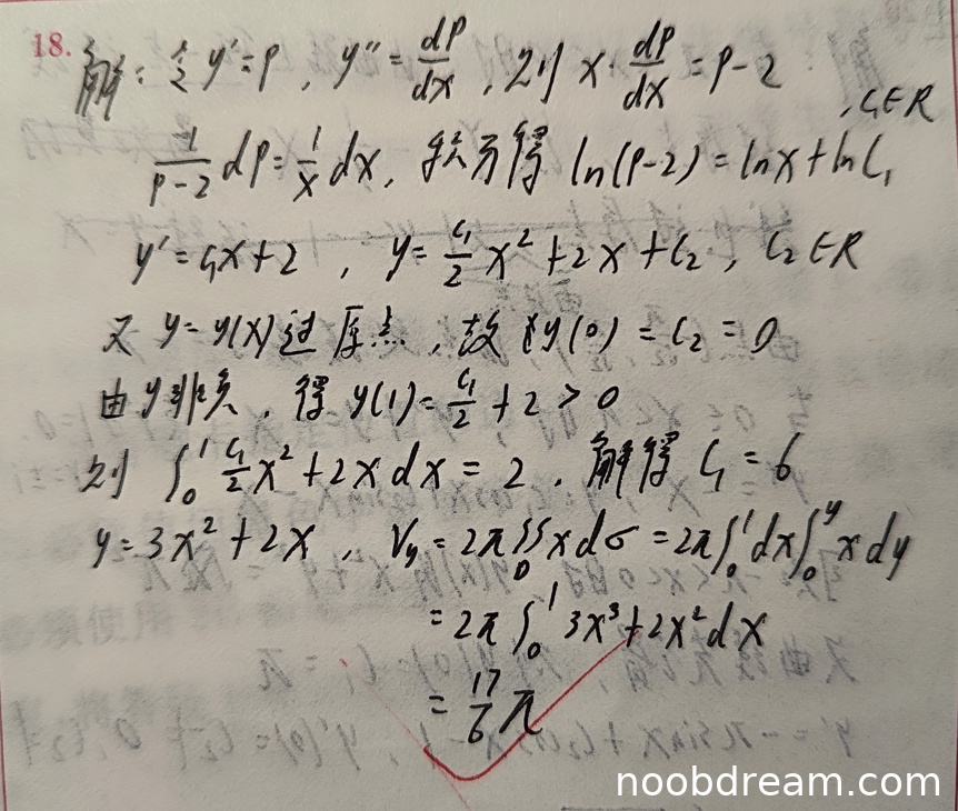 学生正确利用曲线过原点条件得到C₂=0。利用面积条件∫₀¹ y(x)dx=2建立方程求解C₁,计算过程正确,得到C₁=6,最终确定函数为y=3x²+2x。此处得4分。