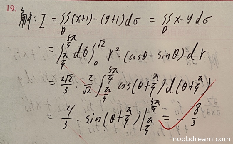 但在第一次识别结果中,有表达式"\(I=\iint_{D}(x + 1)-(y + 1)d\sigma\)",这可能是识别错误,应为"\(I=\iint_{D}(x-y)d\sigma\)"。根据禁止扣分规则,这种识别错误不扣分。