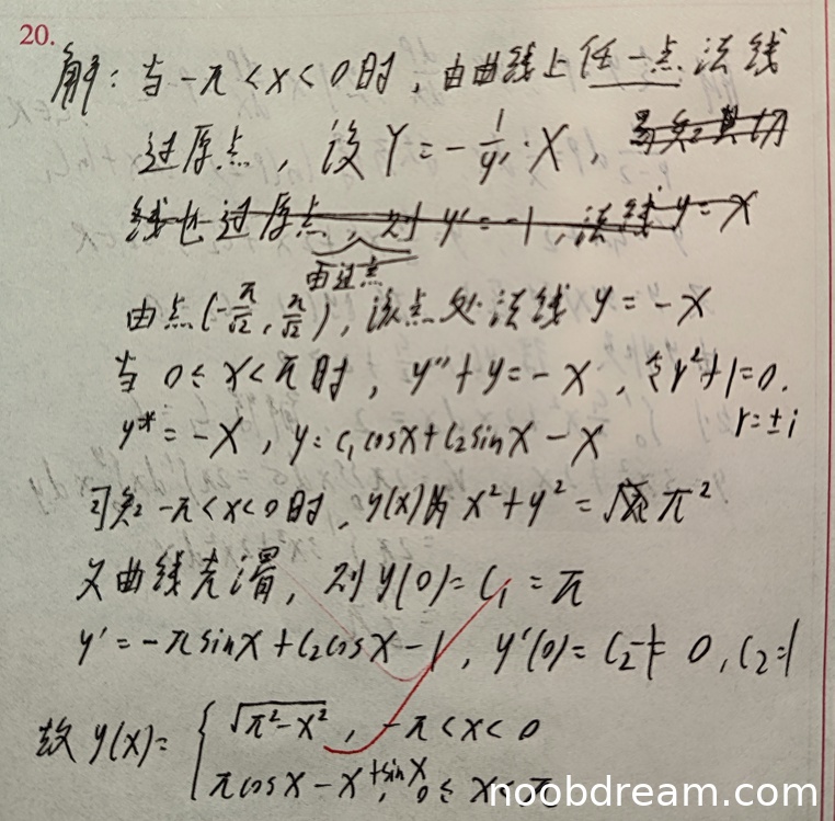 学生第一次识别中错误地认为切线过原点并得出 \(y' = -1\) 和 \(y = x\),这是逻辑错误,但第二次识别中正确使用了法线方程 \(Y = -\frac{1}{y'}X\)(与标准答案等价),并最终得出 \(x^2 + y^2 = \pi^2\),且正确代入点 \(\left(-\frac{\pi}{\sqrt{2}}, \frac{\pi}{\sqrt{2}}\right)\) 确定常数。由于第二次识别正确,且第一次错误可能为识别问题,根据规则不扣分。得4分。