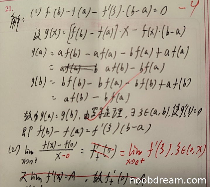 学生构造的辅助函数为 g(x) = [f(b)-f(a)]·x - f(x)·(b-a),与标准答案中的 φ(x) = f(x)-f(a)-[f(b)-f(a)]/(b-a)·(x-a) 不同,但这是证明拉格朗日中值定理的另一种正确方法。学生正确验证了 g(a) = g(b),并应用罗尔定理得出 g'(ξ) = 0,最终得到 f(b)-f(a) = f'(ξ)(b-a)。证明过程完整且逻辑正确。因此给满分5.5分。