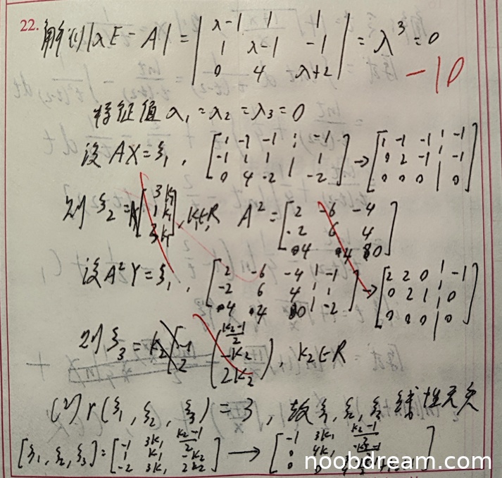 学生作答中,第1次识别结果对ξ₂的求解过程存在多处错误:特征值计算与题目无关;增广矩阵写错(应为(A,ξ₁)但写成A);解的结构错误(缺少特解,只给出齐次解)。第2次识别结果中ξ₁的表示错误(ξ₁是已知向量,不应含参数),ξ₂的求解对象混淆(应是A²ξ₃=ξ₁但写成A²Y=ξ₂)。两个识别版本均未正确求出ξ₂和ξ₃的通解形式,与标准答案差距较大。但学生尝试了求解线性方程组的基本思路,给予部分步骤分。扣4分,得2分。