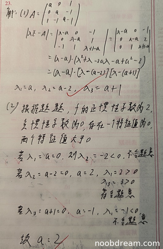 学生正确理解规范形为y₁²+y₂²意味着正惯性指数为2,负惯性指数为0,即两个正特征值和一个零特征值。然后分别讨论三种可能情况:λ₁=0、λ₂=0、λ₃=0,通过排除法得出a=2。推理过程完整,逻辑正确,与标准答案一致。两次识别结果都给出了正确答案,因此给满分6分。