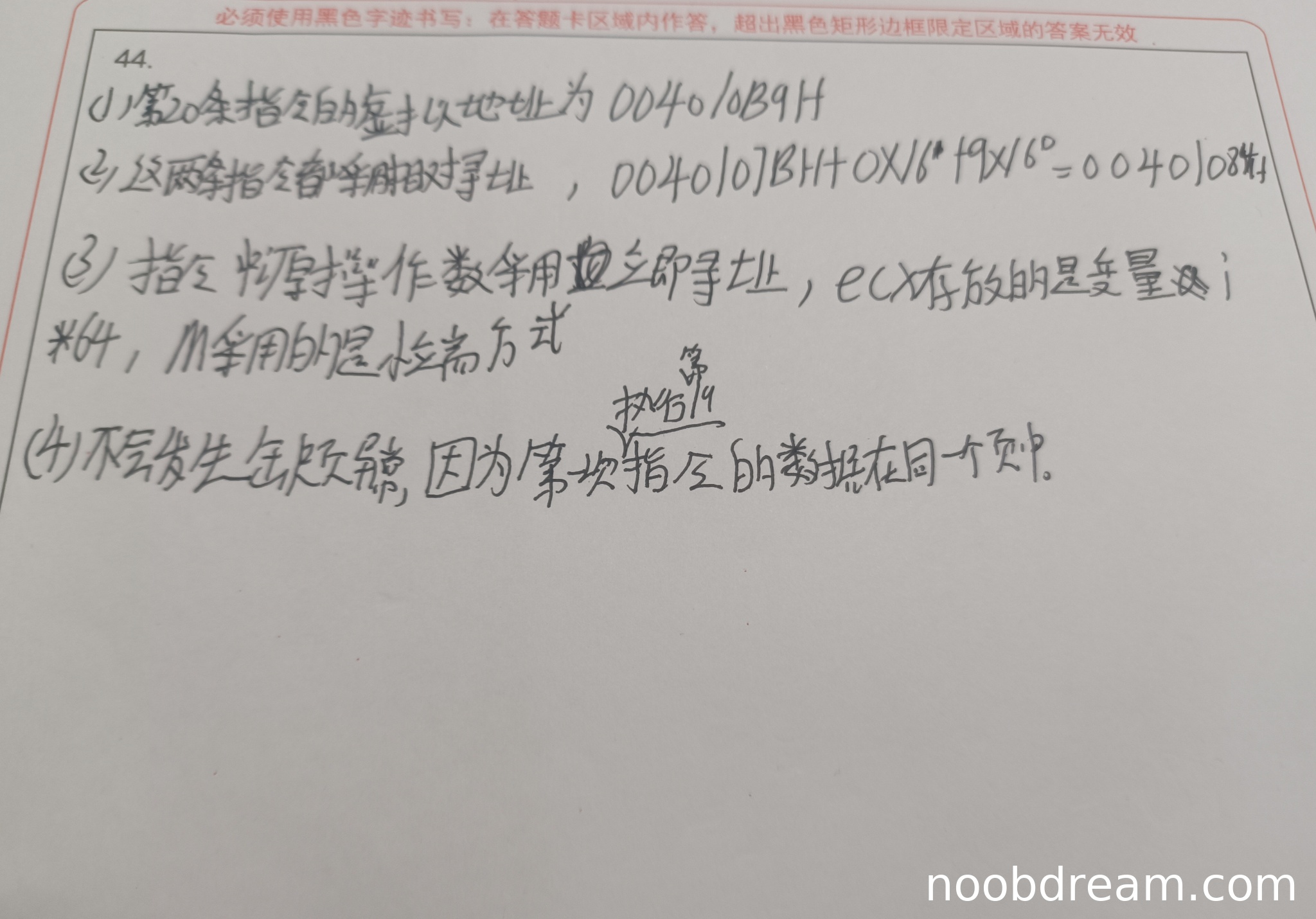 第二问:第一次识别给出的计算过程为0040107BH+9H=00401084H,虽然未明确说明当前指令地址+指令长度,但计算结果正确,思路正确不扣分;第二次识别计算错误(0040107BH+0X16+19X16^0=0040108FH),但根据禁止扣分规则第1条,可能为识别错误,且第一次识别正确,因此不扣分。得1分。