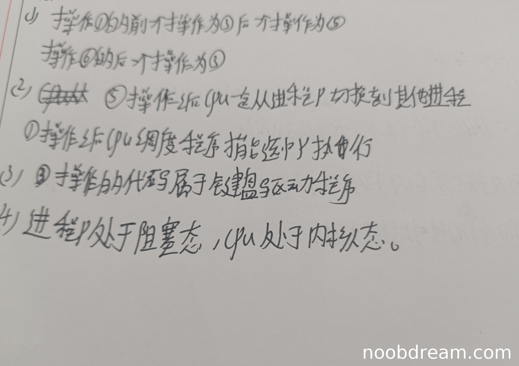第一问:学生回答⑤操作后CPU会从进程P切换到其他进程,但标准答案为②(将进程P插入阻塞队列)。当进程P因等待输入被阻塞时,CPU会切换到其他进程,而⑤(进程P从系统调用返回)是进程P恢复执行后的操作,不会导致切换,学生回答错误,扣1分。