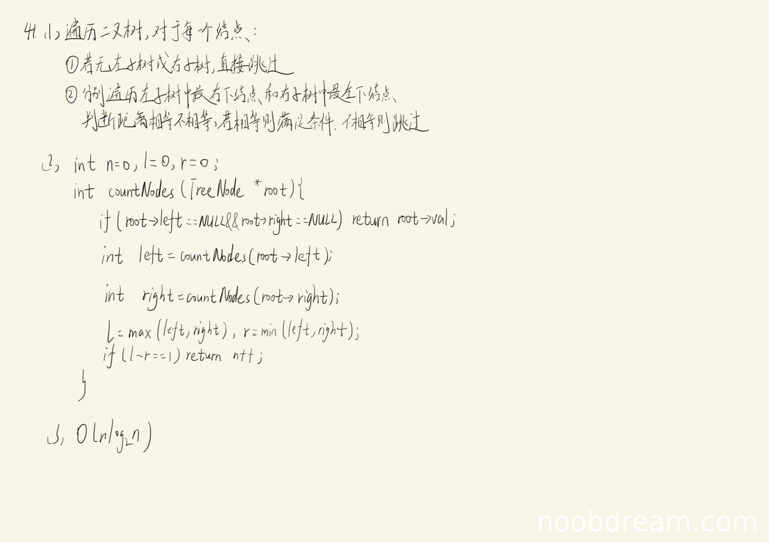 理由:给出的时间复杂度O(log₂n)不正确。即使按照学生设想的算法,也需要遍历所有结点并检查每个结点的左右子树,时间复杂度至少为O(n)或更高。而学生给出的对数复杂度没有合理依据,与算法实际复杂度不符。