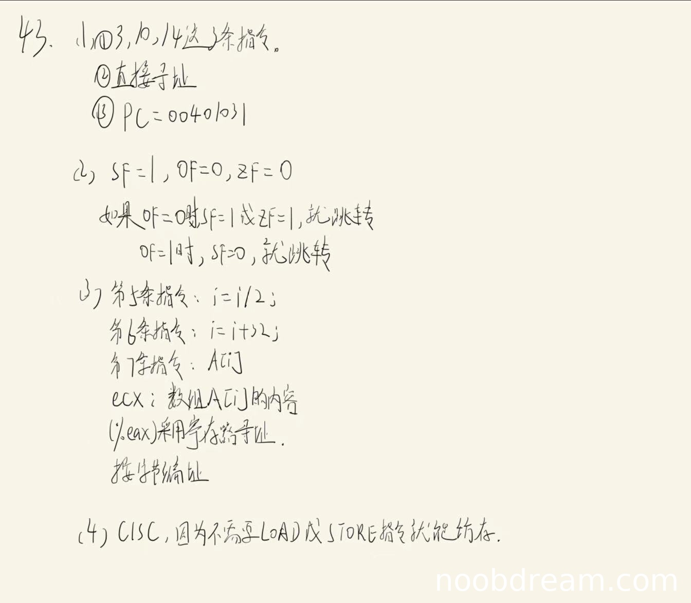 ①指令功能分析:第5条指令功能描述“i=i/2”完全错误(扣1分);第6条指令功能描述“i=i+2”完全错误(扣1分);第7条指令功能描述“A[i]”基本正确(给1分)。②ecx内容回答正确(给1分)。③寻址方式回答“寄存器寻址”错误,应为“寄存器间接寻址”(扣1分)。④编址方式回答正确(给1分)。⑤A[10]地址计算缺失(扣1分)。本小题得2分。