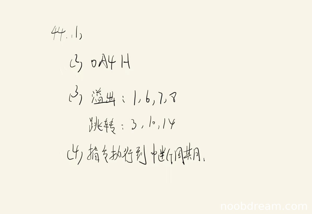 学生回答"溢出:1,6,7,8"和"跳转:3,10,14"。标准答案要求列出两种异常类型,学生只列出了溢出异常,没有列出缺页异常;同时将跳转指令列为异常类型是错误的。每个错误点扣1分,得0分。