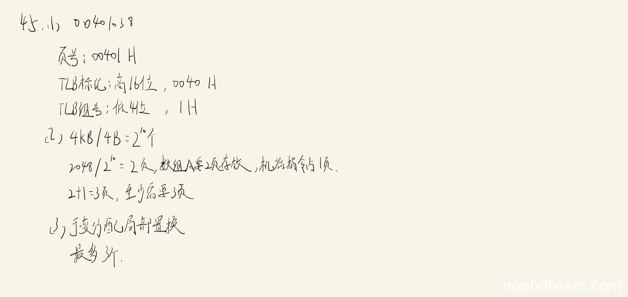 学生第一次识别结果中虚页号计算错误(00401638H的页号应为00401H,但学生写成了00401638),但第二次识别结果正确给出页号0040H(实际应为00401H,可能是识别误差)。TLB标记和组号划分方式正确(高16位为标记,低4位为组号),但具体数值有误。考虑到识别误差和核心逻辑正确,扣1分。
