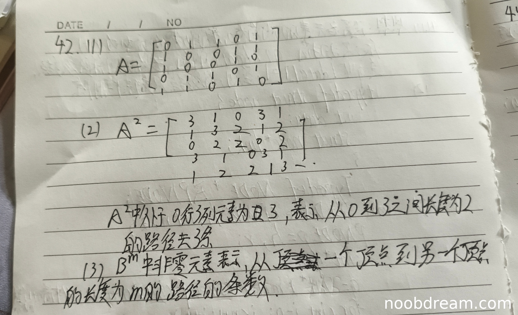\[ A^{2}=\begin{bmatrix} 3&1&0&3&1\\ 1&3&2&1&2\\ 0&2&2&0&2\\ 3&1&0&3&1\\ 1&2&2&1&3 \end{bmatrix} \]且对0行3列元素值3的解释正确(表示从顶点0到顶点3长度为2的路径有3条)。虽然第(1)小题的邻接矩阵错误,但本小题的A²计算和含义解释独立正确,因此得3分。