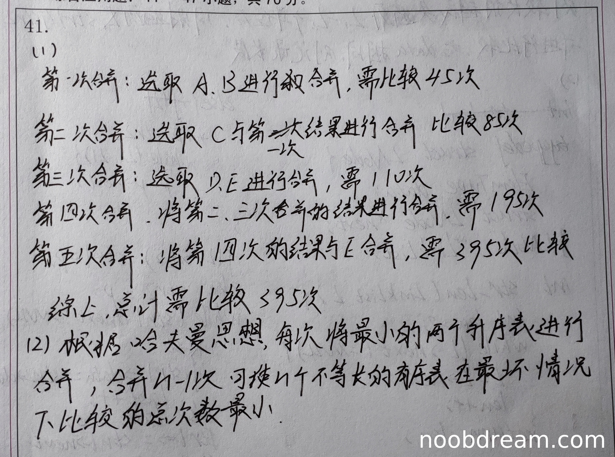 学生给出的合并过程基本正确,采用了类似哈夫曼树的思想,合并顺序为:A+B → AB+C → D+E → ABC+DE → ABCDE+F,这与标准答案一致。但在计算最坏情况下比较次数时,学生给出的每次合并的比较次数(45、85、110、195、395)是错误的,正确应为44、84、109、194、394(因为两个长度分别为m和n的有序表合并,最坏比较次数为m+n-1)。学生计算的总比较次数395次也是错误的,正确应为825次。由于合并过程正确但计算错误,根据标准答案评分说明,合并过程正确给5分,计算错误扣2分,因此本小题得5分。