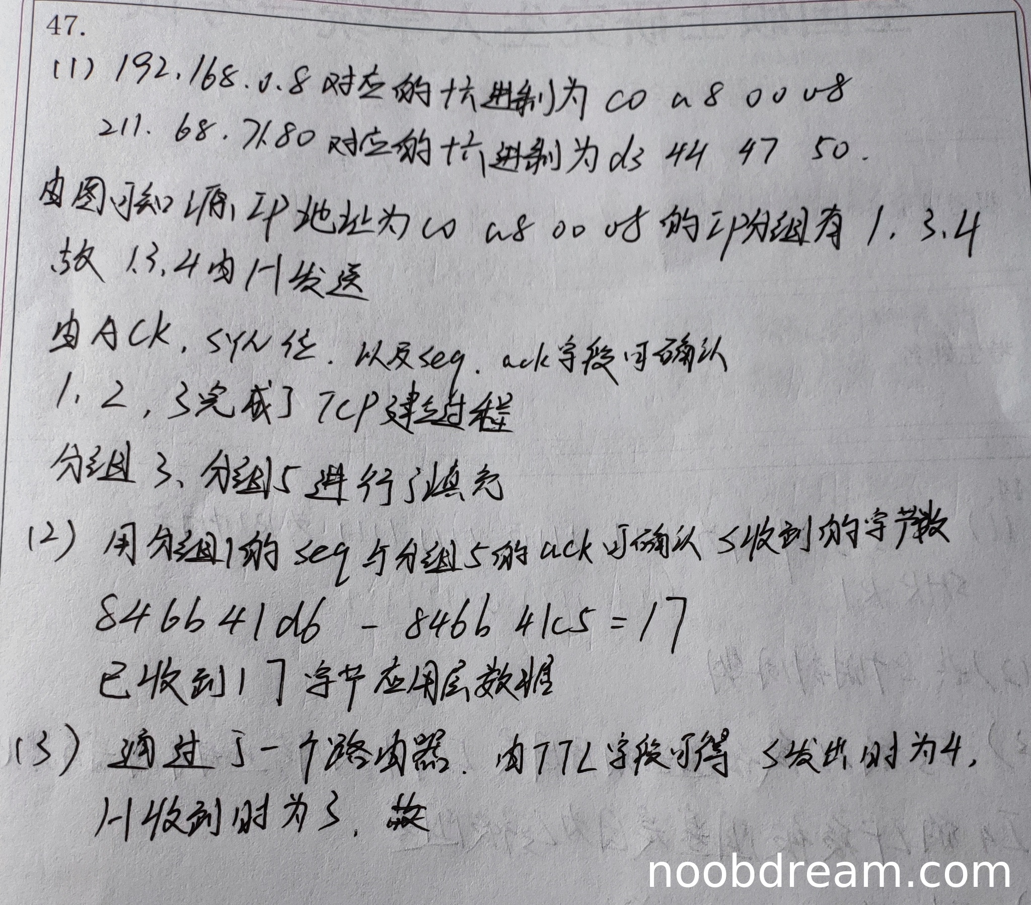学生使用了分组1的seq与分组5的ack计算S收到的字节数,但计算过程存在逻辑错误。标准答案中使用的是3号分组的seq(846b 41c6H)和5号分组的ack(846b 41d6H),而学生使用了1号分组的seq(846b 41c5H)和5号分组的ack(846b 41d6H),导致计算结果为17字节(实际应为16字节)。由于思路正确(通过seq和ack差值计算数据字节数)但结果错误,根据评分说明"若解答结果不正确,但分析过程正确给1分",该部分得1分。