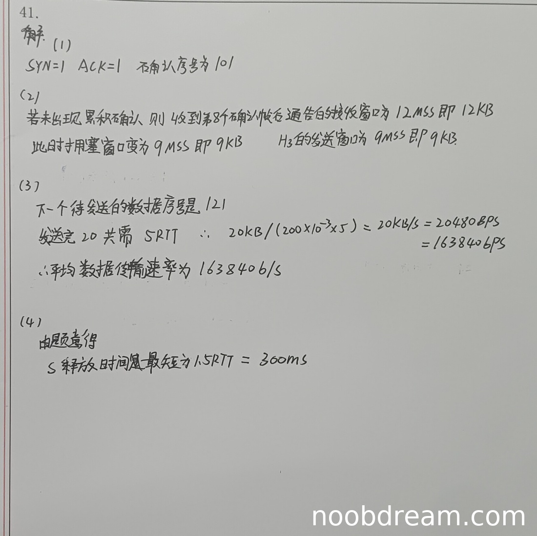 学生答案:S释放时间最短为1.5RTT=300ms,与标准答案一致。得1分。
