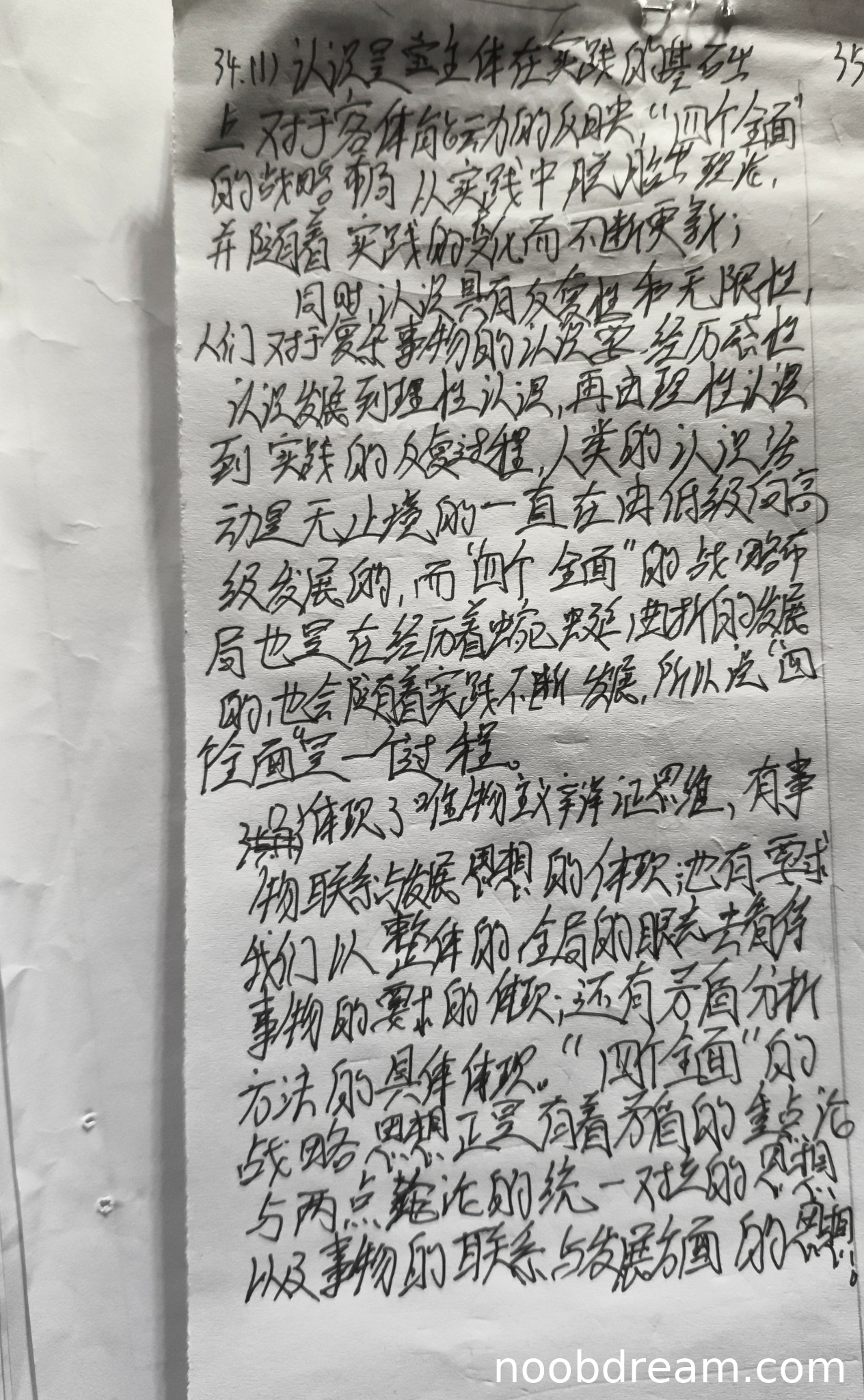 学生答案正确指出了"四个全面"体现了唯物辩证思维,包含事物联系与发展思想、整体全面的观点、矛盾分析方法等要点。特别提到了"矛盾的重点论与两点论的统一",这与标准答案中的矛盾分析方法完全吻合。答案涵盖了辩证思维的三个主要方面,内容完整。得5分。