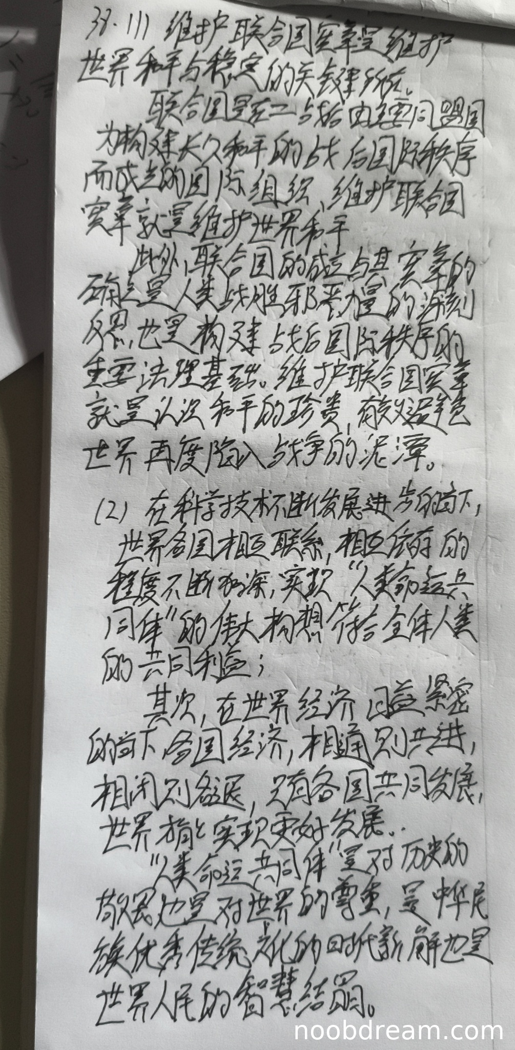 学生答案从科学技术发展和世界经济相互依存角度阐述了“人类命运共同体”符合人类共同利益,并强调共同发展的重要性,这与标准答案中“各国相互依存、休戚与共”“符合国际社会普遍需要”的核心观点一致。答案还提到“对历史的敬畏”和“中华民族优秀传统文化”,虽未直接引用联合国宪章精神,但隐含了合作与发展的理念,思路正确。但未明确说明与联合国宪章精神的继承关系,内容深度不足。根据评分要求,思路正确不扣分,但关键点缺失,扣1分。得4分。