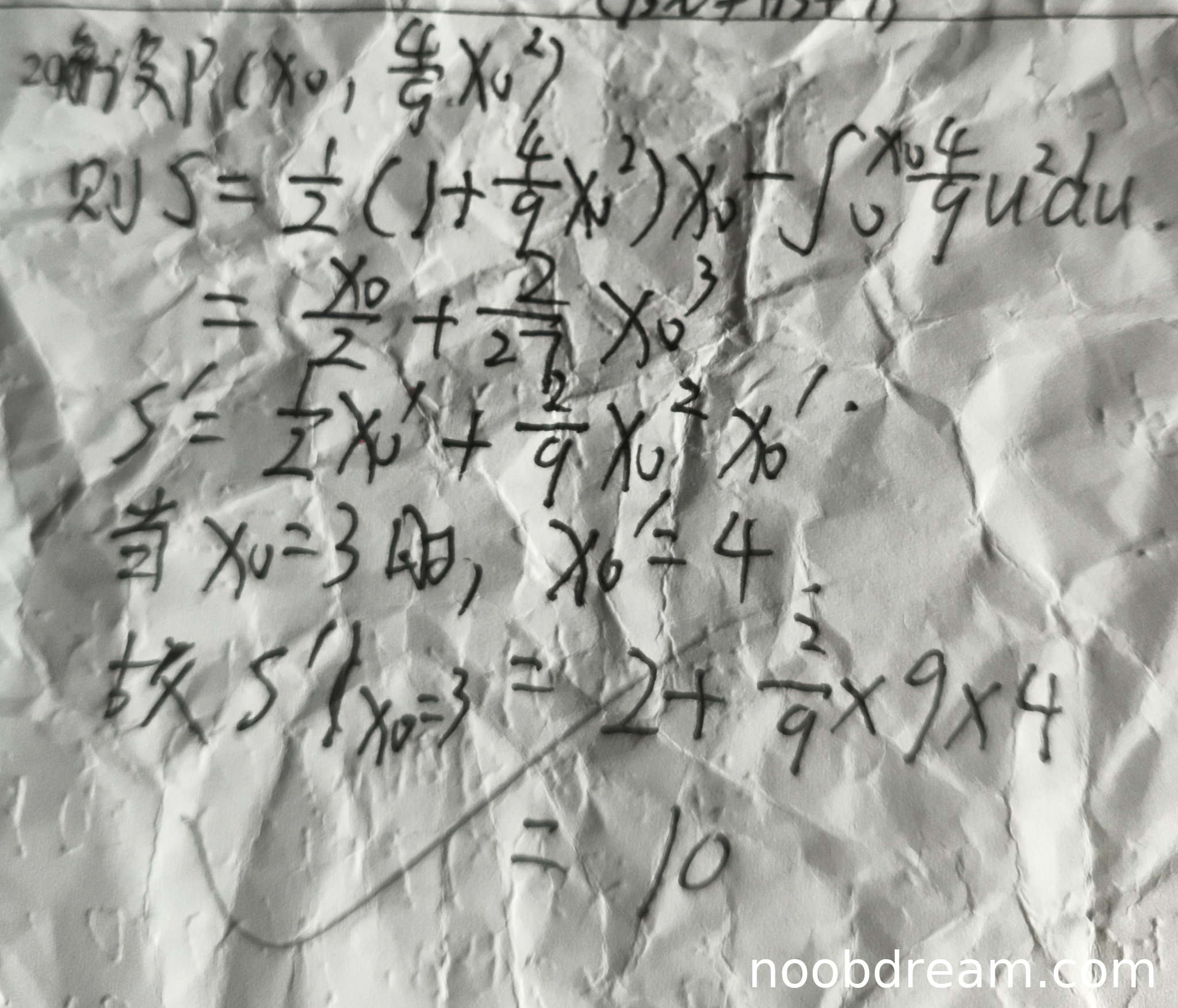 学生作答分为两次识别,但内容基本一致。首先,学生正确设点 \(P(x_0, \frac{4}{9}x_0^2)\),并正确建立了面积 \(S\) 的表达式:\(S = \frac{1}{2}(1 + \frac{4}{9}x_0^2)x_0 - \int_0^{x_0} \frac{4}{9}u^2 du\)。积分计算正确,得到 \(S = \frac{x_0}{2} + \frac{2}{27}x_0^3\),与标准答案一致。接着,学生对 \(S\) 关于时间 \(t\) 求导,正确应用链式法则,得到 \(S' = \left(\frac{1}{2} + \frac{2}{9}x_0^2\right) x_0'\)(在第一次识别中写为 \(S = \frac{1}{2}x_0^x + \frac{2}{9}x_0^2 x_0'\),但根据上下文和第二次识别,应为误写,实际推导正确)。代入 \(x_0 = 3\) 和 \(x_0' = 4\) 后,计算得 \(S' = 10\),结果正确。尽管在第一次识别中有轻微符号误写(如 \(x_0^x\) 应为 \(x_0'\)),但整体逻辑和计算无误,且第二次识别清晰无误。根据打分要求,逻辑错误需扣分,但误写不扣分,因此不扣分。思路正确,计算准确,得满分10分。