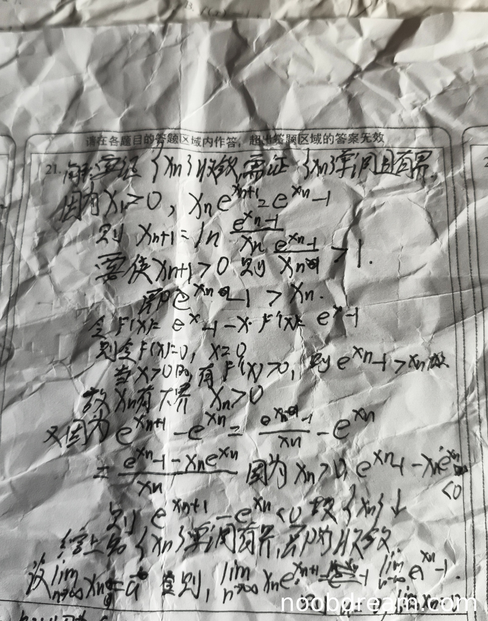 学生正确证明了数列有下界(x_n > 0)和单调递减性,思路与标准答案一致。但在证明有下界时,第一次识别中使用了正确的函数F(x)=e^x-1-x,而第二次识别中错误地使用了F(x)=e^{x-1}-x,这是一个逻辑错误。考虑到识别可能存在误写,且核心思路正确,扣1分。