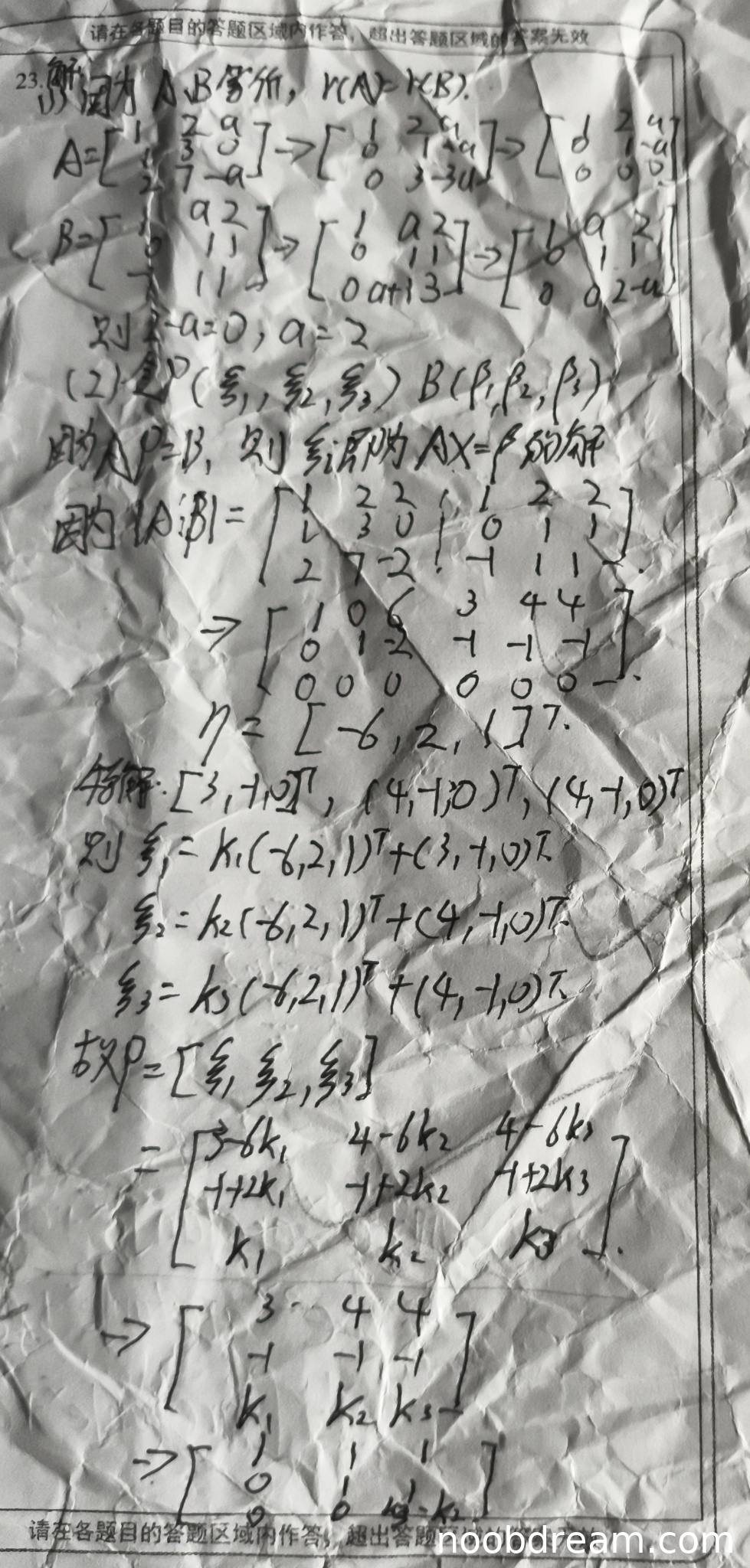 第1次识别中,学生正确理解了AP=B等价于求解三个线性方程组AX=β_i,增广矩阵化简正确,得到的基础解系和特解正确,构造的P矩阵形式正确。但在最后对P进行变换时出现了错误,且没有给出P可逆的条件。第2次识别中,同样得到了正确的P矩阵形式,但后续变换不完整且没有给出可逆条件。由于学生没有给出P可逆的完整条件(k₂≠k₃),扣1分。得4.5分。