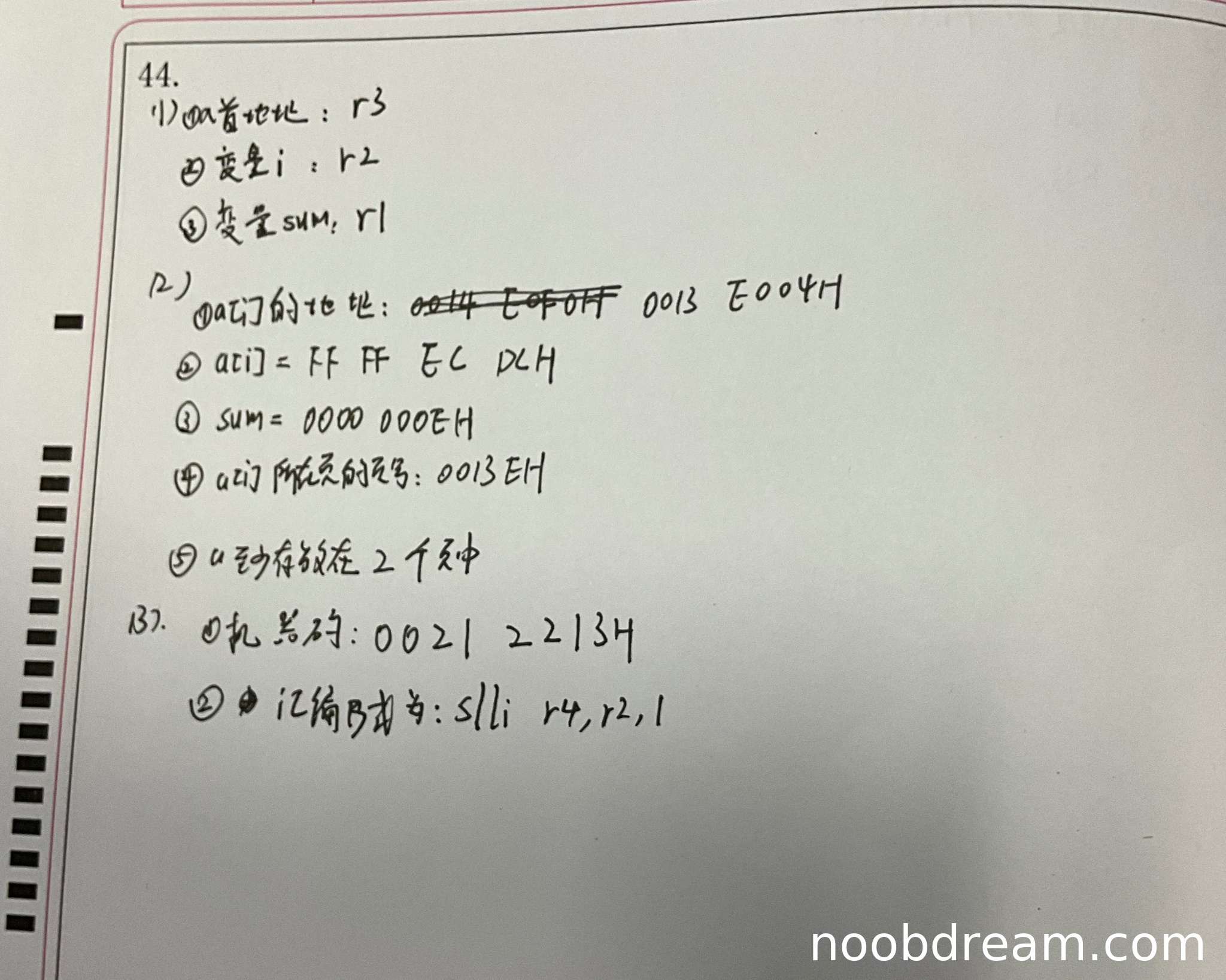 学生答案正确识别出数组a的首地址为r3(编号03H)、变量i为r2(编号02H)、变量sum为r1(编号01H),与标准答案完全一致。得3分。