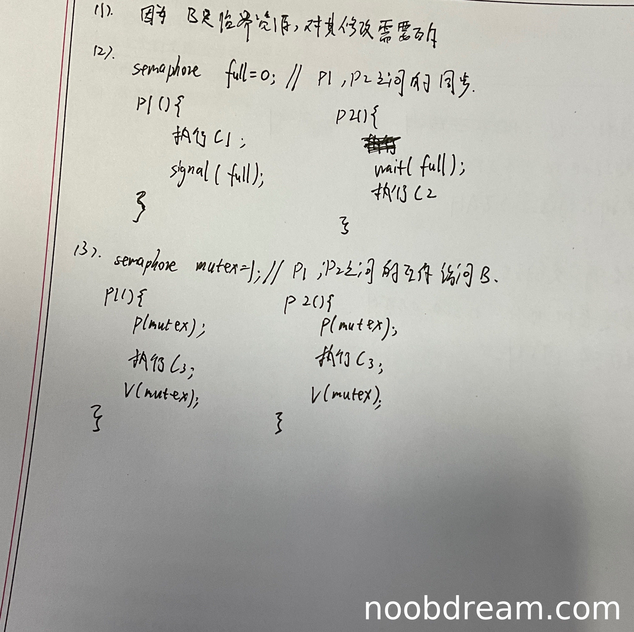 学生使用mutex=1信号量来实现互斥,P1和P2都通过P(mutex)和V(mutex)来保护C3操作,思路完全正确。虽然使用了P/V而不是wait/signal,但这是信号量操作的常见表示方法,不影响理解。得3分。