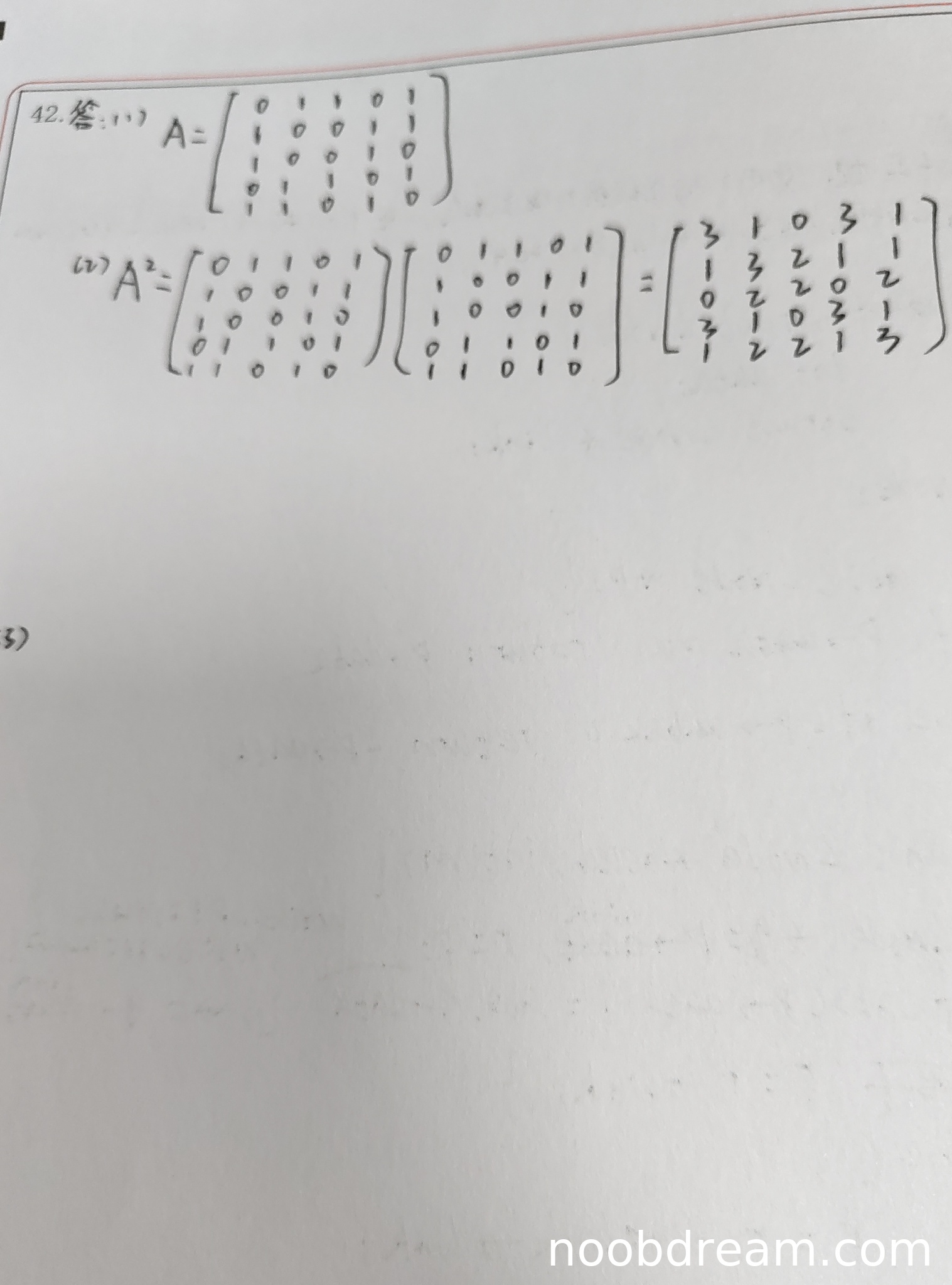 学生第一次识别结果计算 \(A^2\) 为: \[ A^{2}=\begin{bmatrix}3&1&0&3&1\\1&3&2&1&2\\1&0&2&0&3\\3&1&2&2&1\\1&2&1&3&3\end{bmatrix} \] 与标准答案对比,多个元素错误(如第2行第0列应为0但写为1,第2行第4列应为2但写为3等),但部分正确(如第0行第3列元素为3,与标准答案一致)。第二次识别结果矩阵维度错误,不予采纳。由于计算基于错误的邻接矩阵,但0行3列元素值正确(3),且含义解释正确(从顶点0到顶点3长度为2的路径有3条),因此对元素值本身不扣分,但矩阵计算错误扣1分。含义解释正确,不扣分。综合扣1分,得2分。
