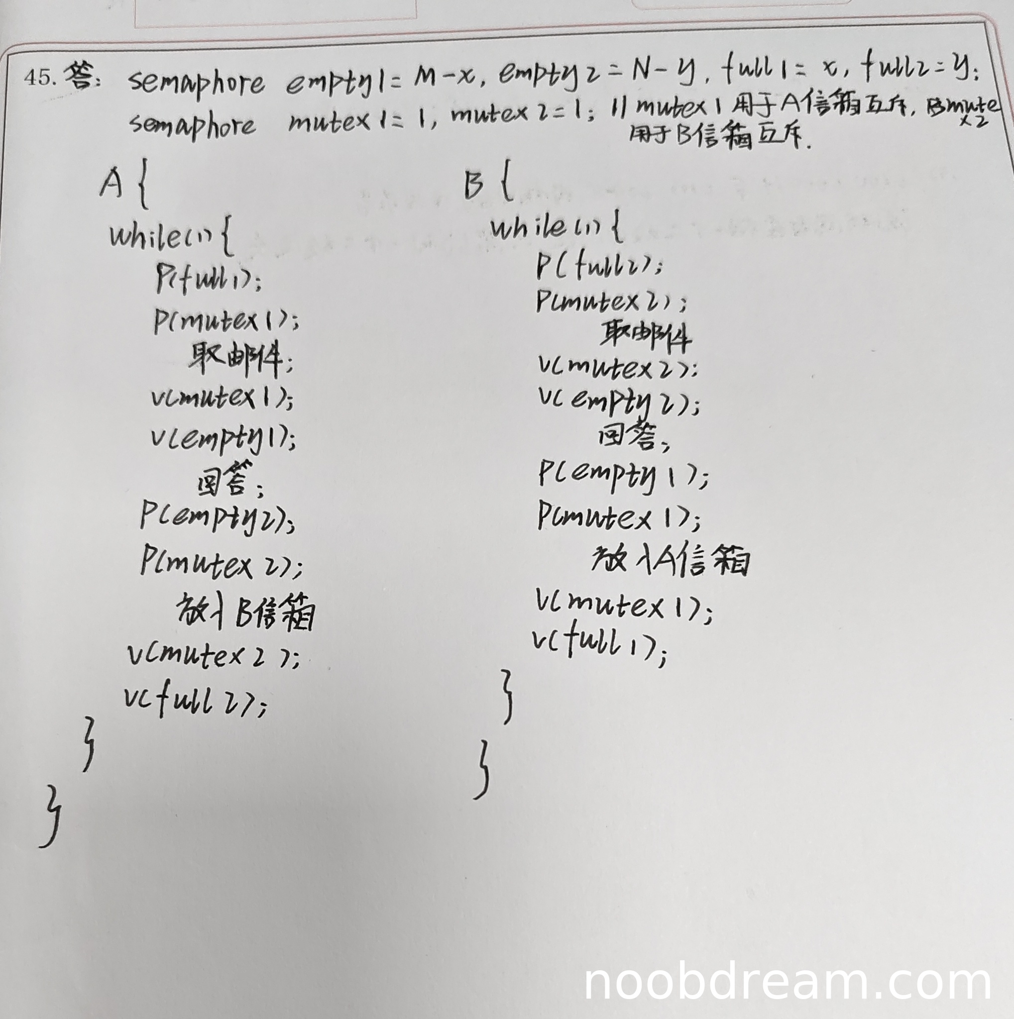 理由:B进程的同步互斥操作完全正确。P(full2)和P(mutex2)的顺序正确,V(mutex2)和V(empty2)的顺序正确,P(empty1)和P(mutex1)的顺序正确,V(mutex1)和V(full1)的顺序正确。所有P、V操作的位置和使用都符合要求。