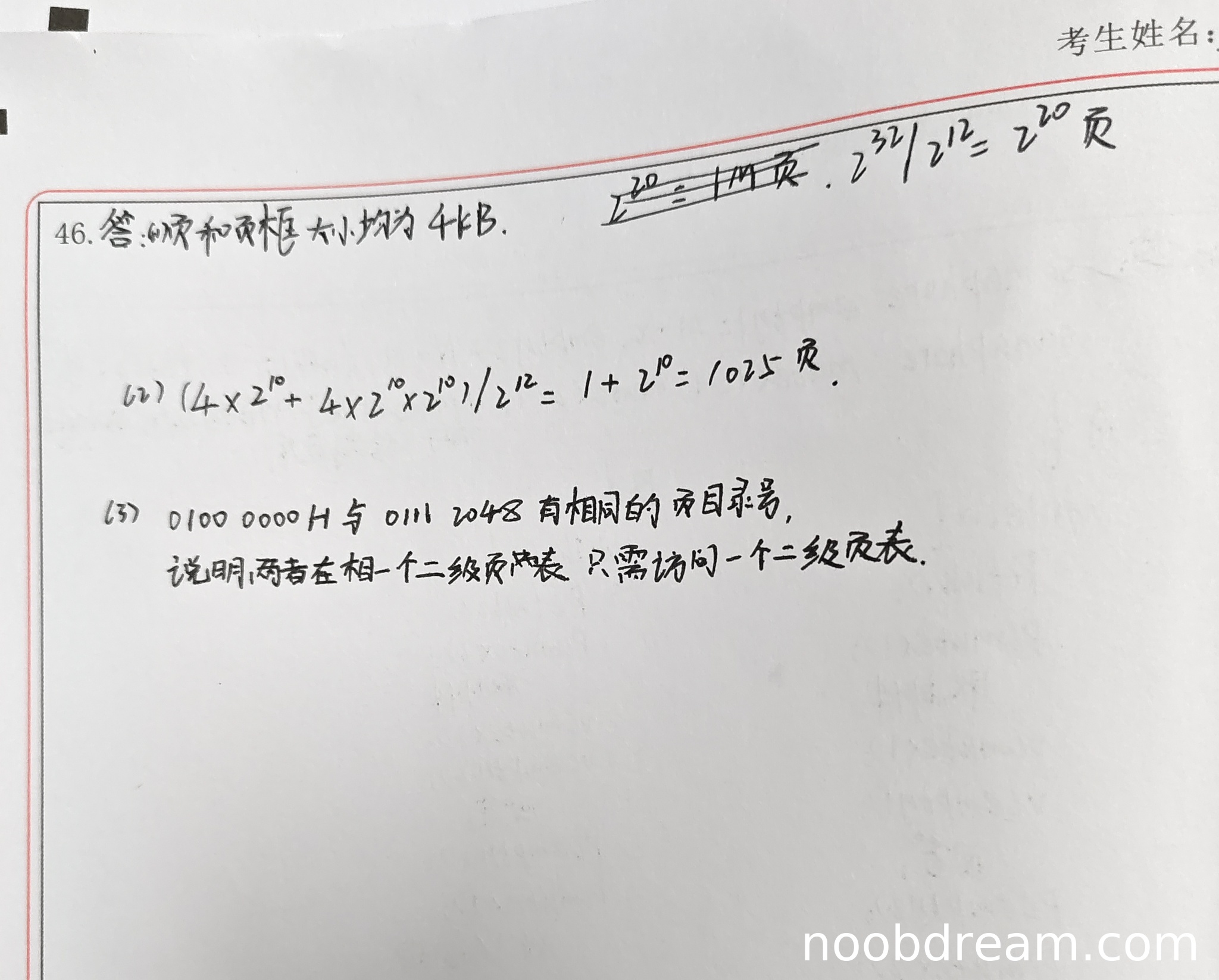 学生计算过程为$(4×2^{10}+4×2^{10}×2^{10})/2^{12}=1+2^{10}=1025$页,与标准答案$(2^{10}*4)/2^{12}+(2^{20}*4)/2^{12}=1025$页完全一致,思路和结果正确。得2分。