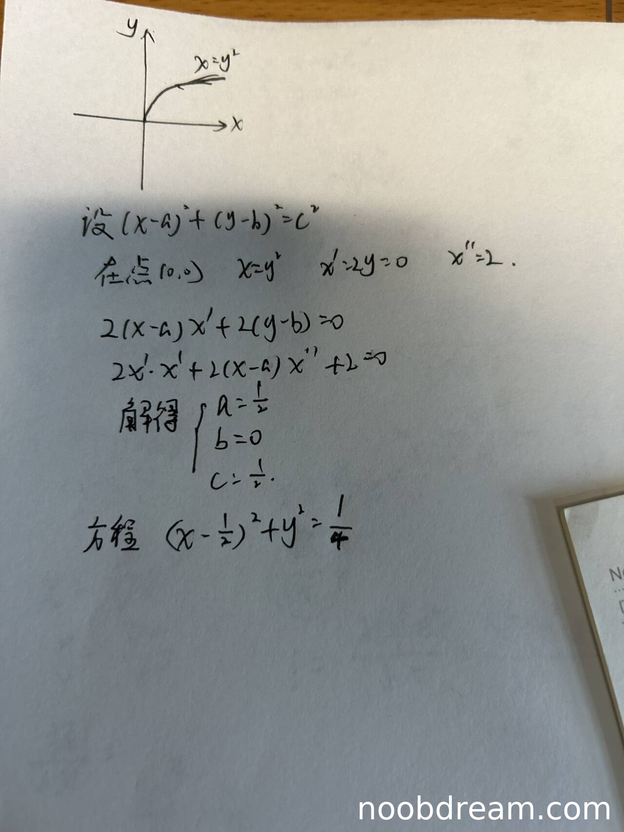 - 代入点 \((0,0)\) 和导数值,解得 \(b=0\),\(a=\frac{1}{2}\),再利用圆过点 \((0,0)\) 解得 \(c=\frac{1}{2}\),计算过程无误。