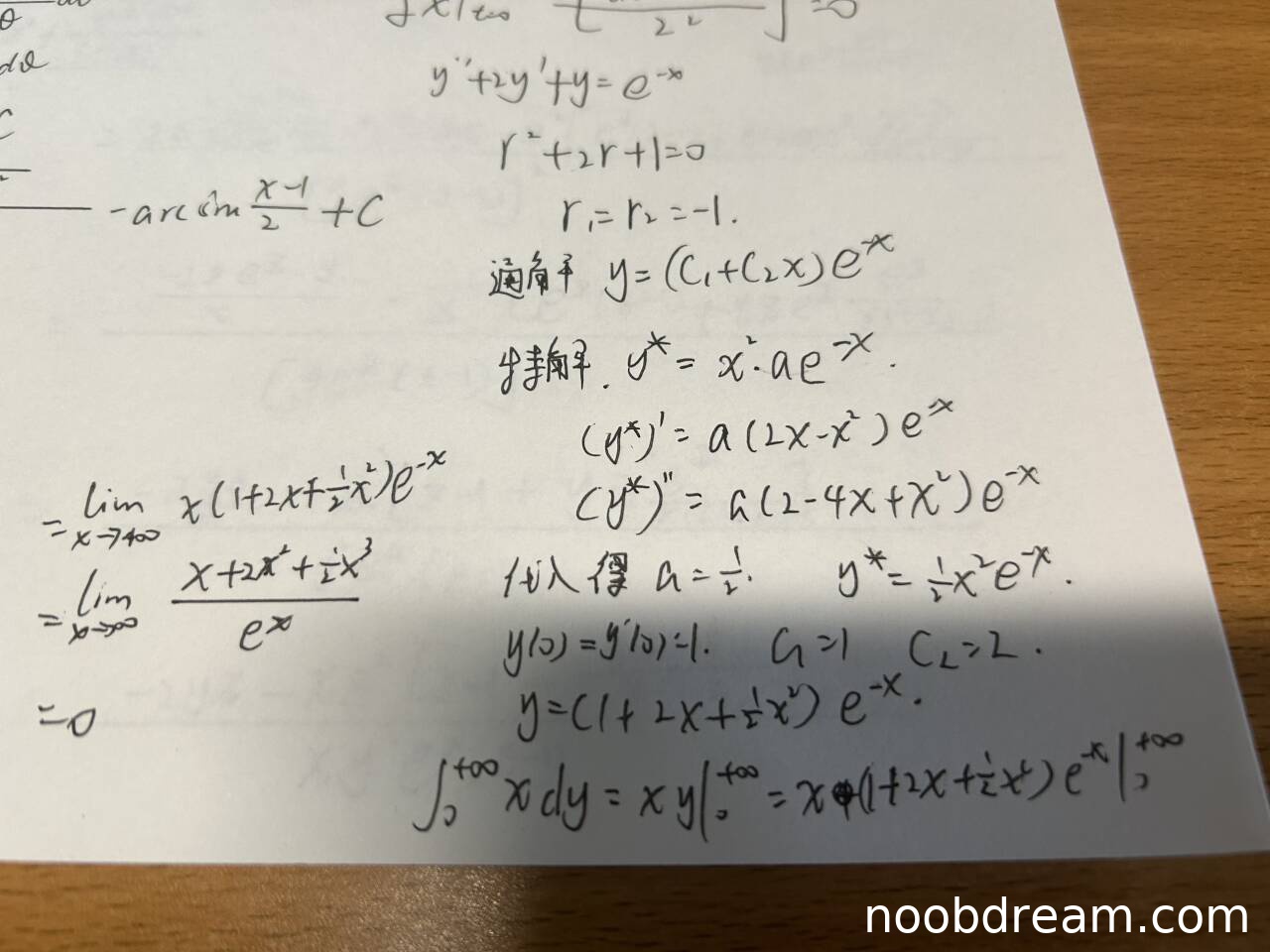 - 学生直接代入极限得到积分值为0,但根据正确计算,\(y'(x) = (2 + x - 1 - 2x - \frac{1}{2}x^2)e^{-x} = (1 - x - \frac{1}{2}x^2)e^{-x}\),积分 \(\int_0^{+\infty} x y'(x)\,dx\) 实际值为 \(-4\)。