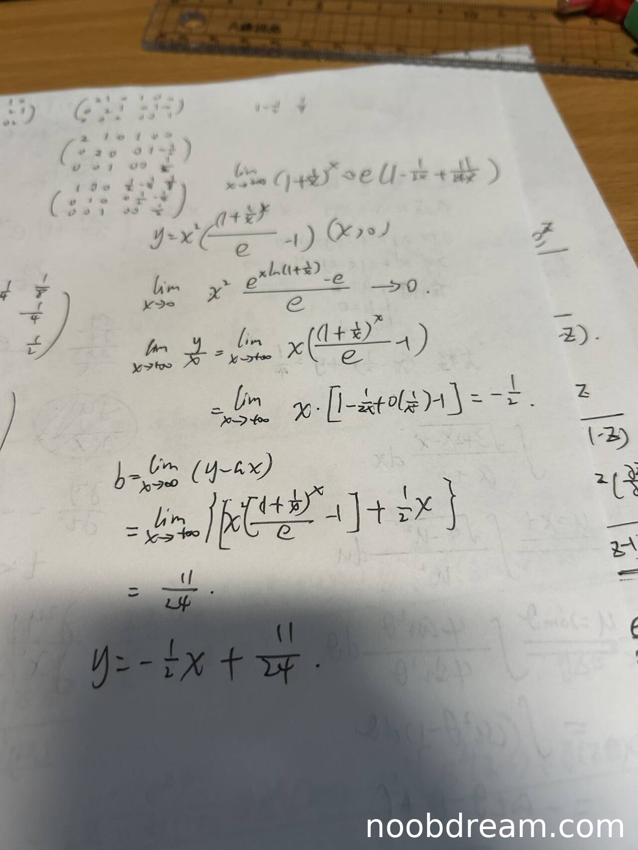 学生作答在计算斜率a时,使用了正确的思路:a = limx→∞ y/x。通过变量代换和泰勒展开,得到a = -1/2,这一步计算正确。在计算截距b时,学生直接给出了b = 11/24的结果,但没有展示详细的计算过程。