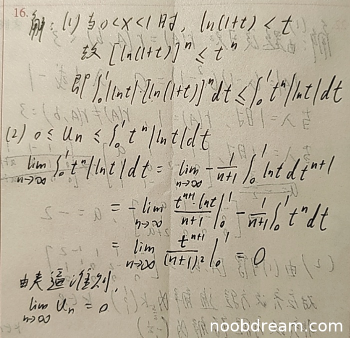 学生正确建立了0 ≤ u_n ≤ ∫₀¹ t^n|ln t|dt的不等式关系,并尝试计算右侧积分的极限。但在计算过程中存在逻辑错误:
