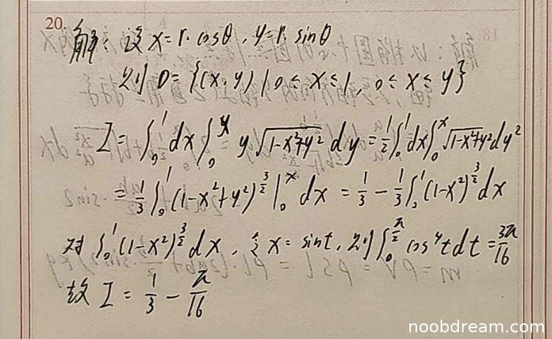 - 积分区域描述错误:学生写为 \(D=\{(x,y)|0\leq x\leq1,0\leq x\leq y\}\),正确应为 \(0 \leq x \leq 1, 0 \leq y \leq x\)。这是明显的逻辑错误,扣2分。