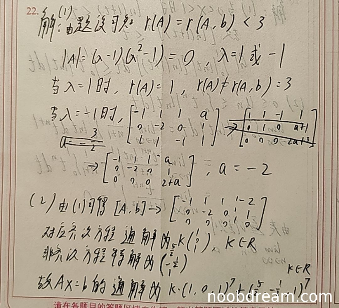 第一次识别:学生正确写出增广矩阵行简化形式,齐次方程通解正确,但特解计算错误(应为(3/2,-1/2,0)ᵀ而非(5/2,-1/2,1)ᵀ)。由于特解错误,扣2分,得4分。