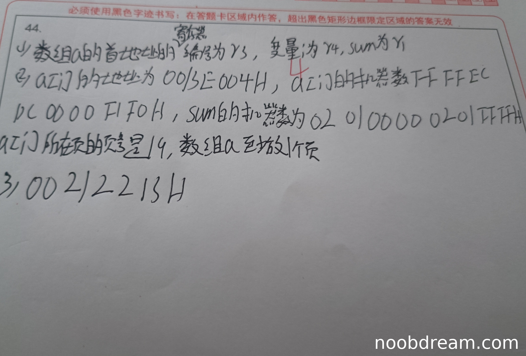 学生第一次识别结果中,数组a的首地址寄存器编号为r3(正确),变量i的寄存器编号为r4(错误,应为r2),sum的寄存器编号为r1(正确)。第二次识别结果中,数组a的首地址寄存器编号为r3(正确),变量i的寄存器编号为r4(错误,应为r2),sum的寄存器编号为r1(正确)。根据指令序列分析,slli指令对r2左移2位,说明r2存放i;add指令将r3与r4相加,r4是左移后的结果,r3是基地址,说明r3存放数组a的首地址;最后add指令将r1与r5相加,r5是加载的a[i]值,说明r1存放sum。因此,变量i的寄存器编号应为r2,学生两次识别均错误。但考虑到识别可能将"r2"误写为"r4"(字符相似),根据禁止扣分规则第1条,判断为误写,不扣分。故本题得3分。