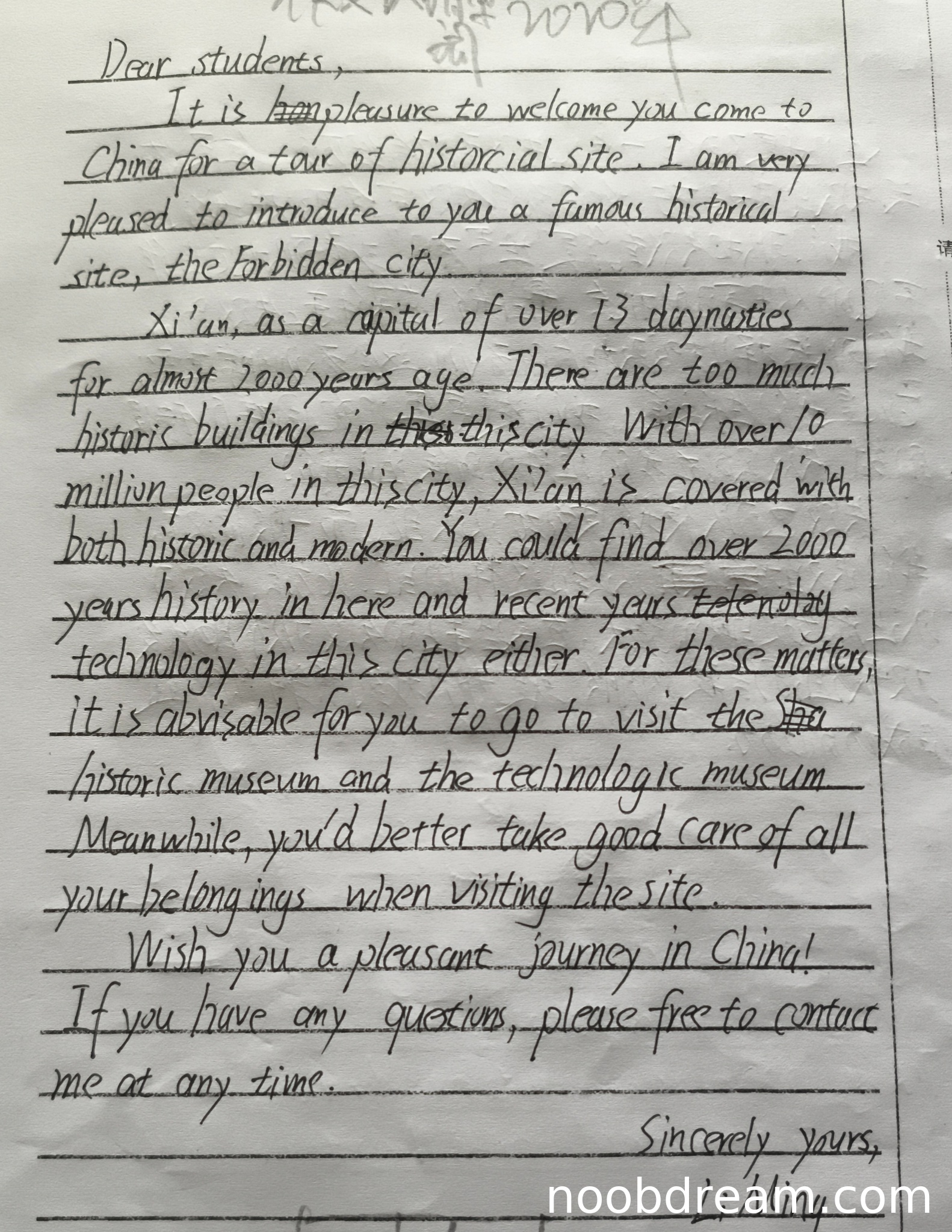 理由:存在较多语法和表达错误,如"Xi'an, as a capital of over 13 dynasties for almost 2000 years ago"中的"ago"多余;"Xi'an is covered with both historic and modern"表达不完整;"technology museum"与历史景点游览主题不符;"please be free to contact"应为"feel free to contact"。这些错误影响了理解的准确性。