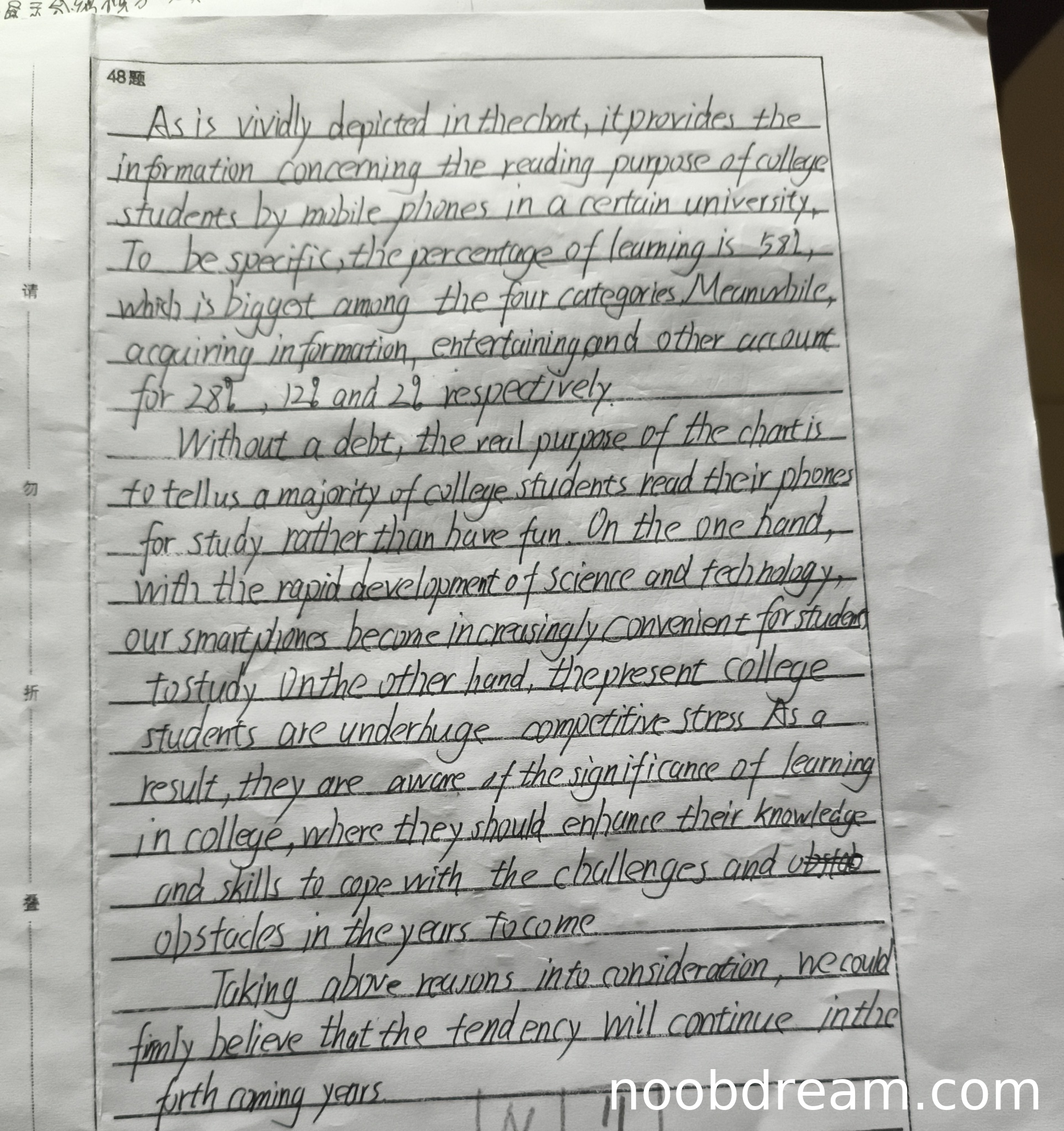理由:学生基本完成了图表解读任务,包含了主要数据点(学习58%、获取信息28%、娱乐12%、其他2%),但存在数据误读问题。图表实际数据显示学习占比59.50%,而学生写作中写成了58%;"获取信息"实际应为17%,学生误写为28%;"打发时间"实际为20.50%,学生误写为娱乐12%。虽然数据存在偏差,但整体趋势判断正确(学习为主要目的),且完成了原因分析和趋势预测。根据评分标准第三档"包含多数内容要点",扣1分。
