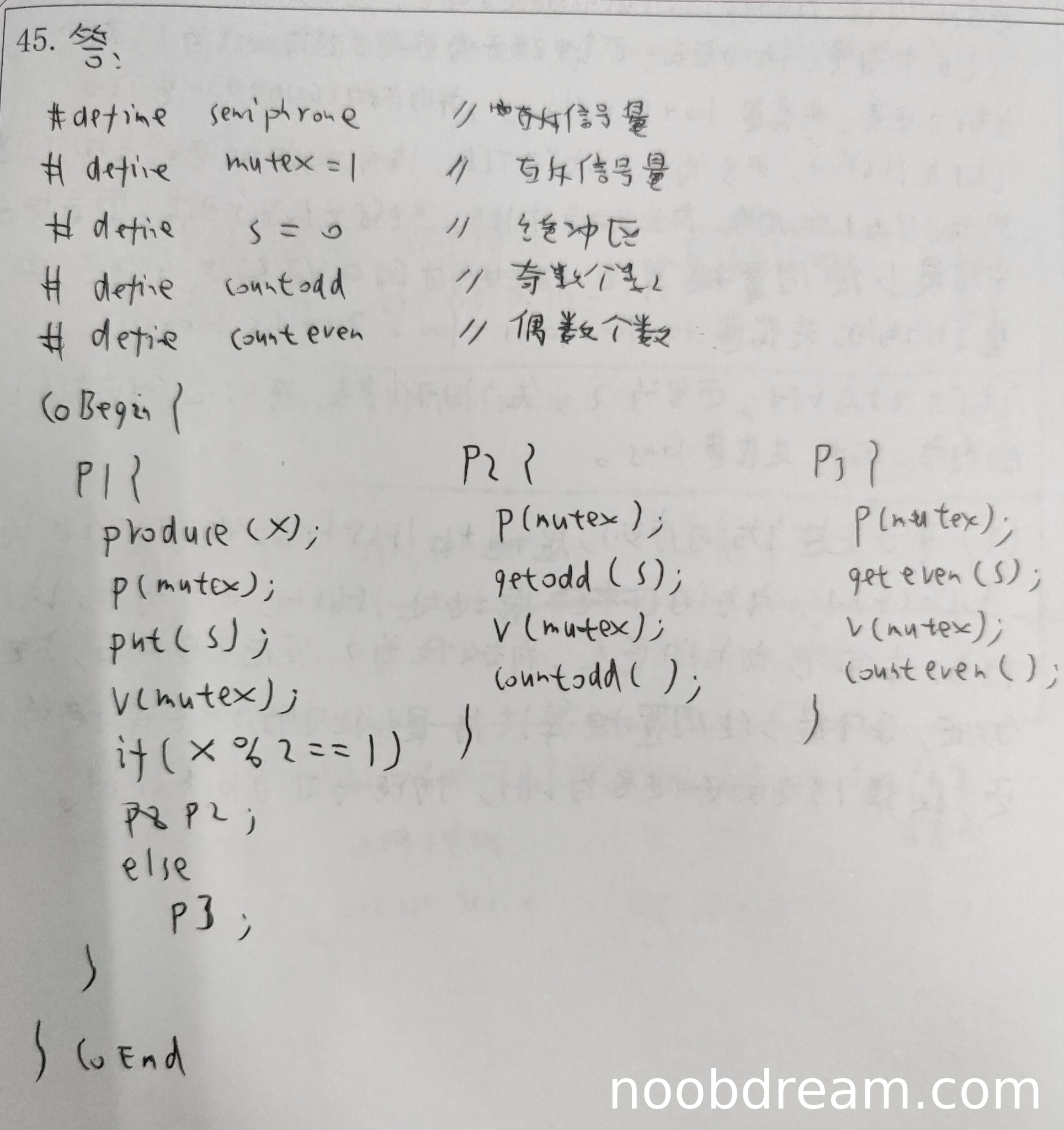 理由:P2和P3进程正确地使用了mutex信号量来保护临界区,这是正确的互斥实现。但是缺少对同步信号量的等待操作(P(odd)和P(even)),也没有在取出数据后释放空单元(V(empty))。由于正确实现了互斥部分,给予部分分数。