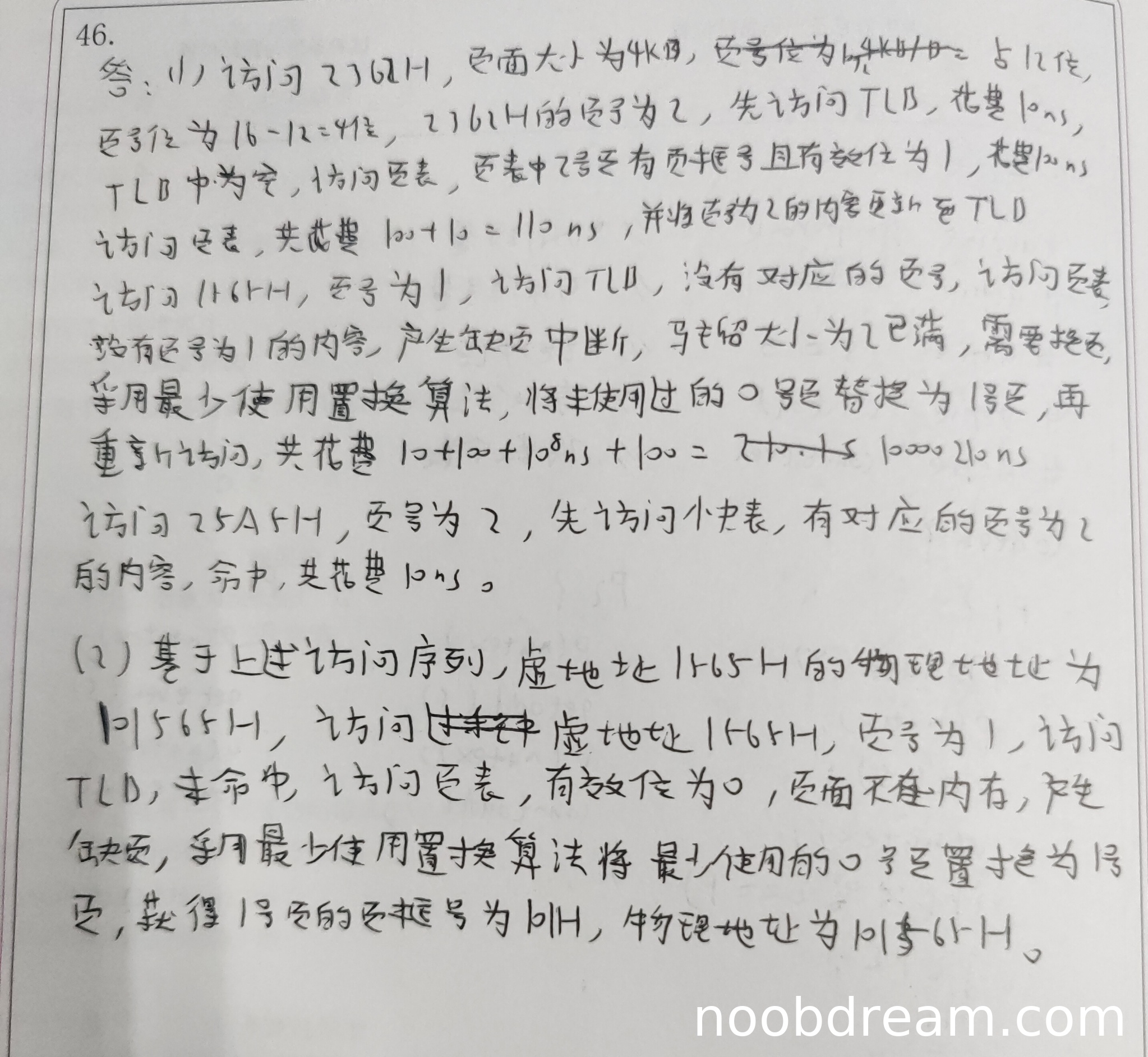 学生第一次识别结果中,对2362H(识别为2762H,可能是误写)的访问时间计算为110ns,但标准答案中应为210ns(10ns TLB + 100ns 页表 + 100ns 内存访问),学生漏掉了最后的内存访问时间,因此扣1分;对1565H(识别为1F61H,可能是误写)的访问时间计算为100000210ns,与标准答案一致,得2分;对25A5H(识别为25A5H)的访问时间计算为10ns,但标准答案中应为110ns(10ns TLB + 100ns 内存访问),学生漏掉了内存访问时间,因此扣1分。第二次识别结果中,对2362H(识别为236H,可能是误写)的访问时间计算为110ns,同样漏掉内存访问时间,扣1分;对1565H(识别为165H,可能是误写)的访问时间计算为210ns(具体结果看不清,但根据描述可能漏掉了缺页处理时间),与标准答案不一致,扣2分;对25A5H(识别为25AFH,可能是误写)的访问时间计算为10ns,漏掉内存访问时间,扣1分。综合两次识别,取最高得分情况:2362H得1分(满分2分),1565H得2分(满分2分),25A5H得1分(满分2分),本小题总得分为1+2+1=4分。
