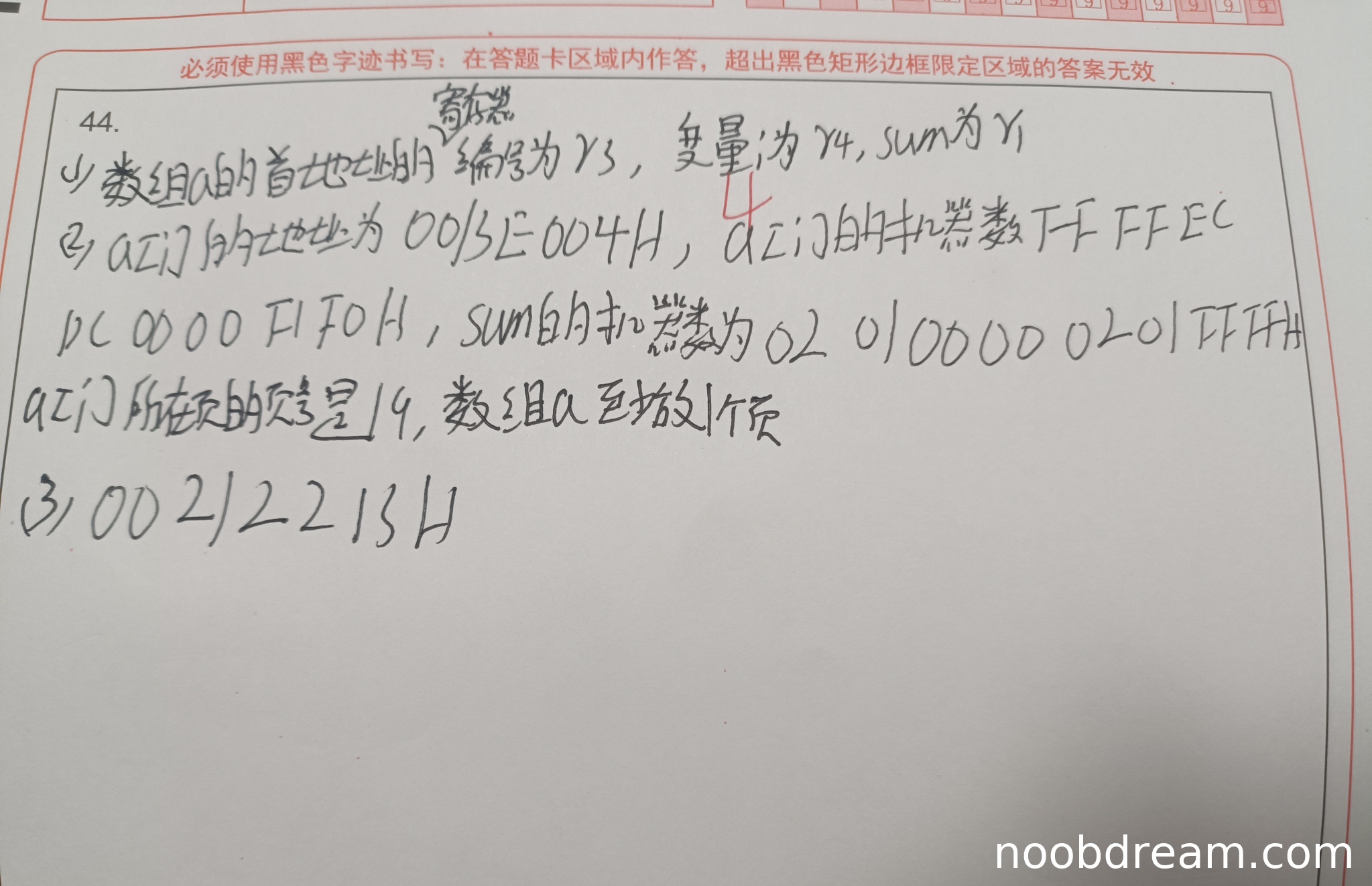 学生答案中,数组a的首地址寄存器编号为r3(正确),变量i的寄存器编号为r4(错误,应为r2),sum的寄存器编号为r1(正确)。根据标准答案,数组a首地址为r3,i为r2,sum为r1。学生将i误写为r4,但r2和r4在识别中可能因字符相似(如2和4)而误写,根据禁止扣分规则第1条,判断为误写不扣分。因此本题得3分。
