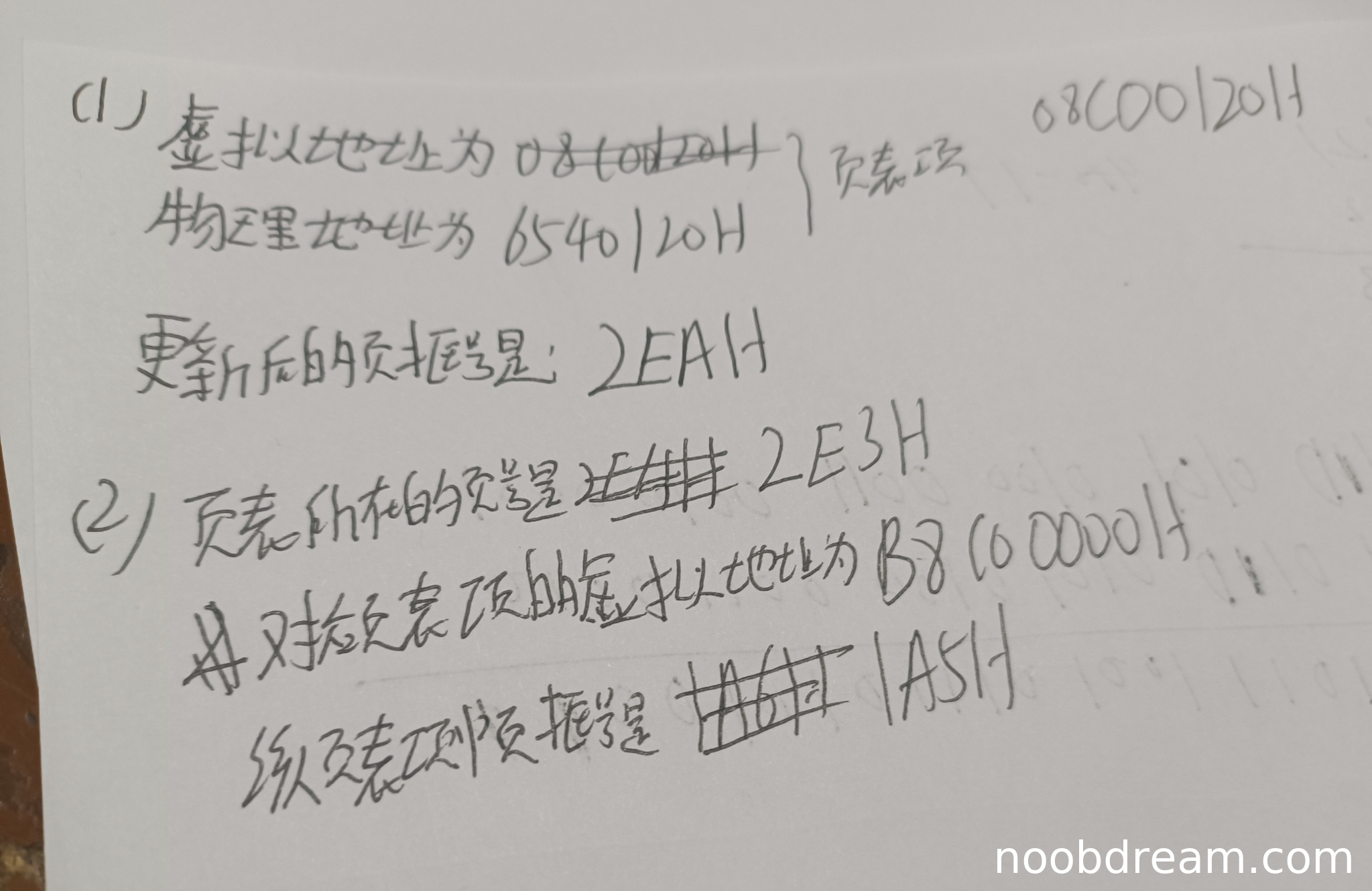 学生两次识别结果中,页号"2E3H"正确;第一次识别结果中虚拟地址"B8000000H"错误(应为B8C00B8CH),页框号"1A51H"错误(应为195H);第二次识别结果中虚拟地址"B8C00000H"错误(应为B8C00B8CH),页框号"1A5H"错误(应为195H)。虚拟地址和页框号均存在逻辑错误,但页号正确。由于虚拟地址计算错误扣2分,页框号错误扣1分,得1分。